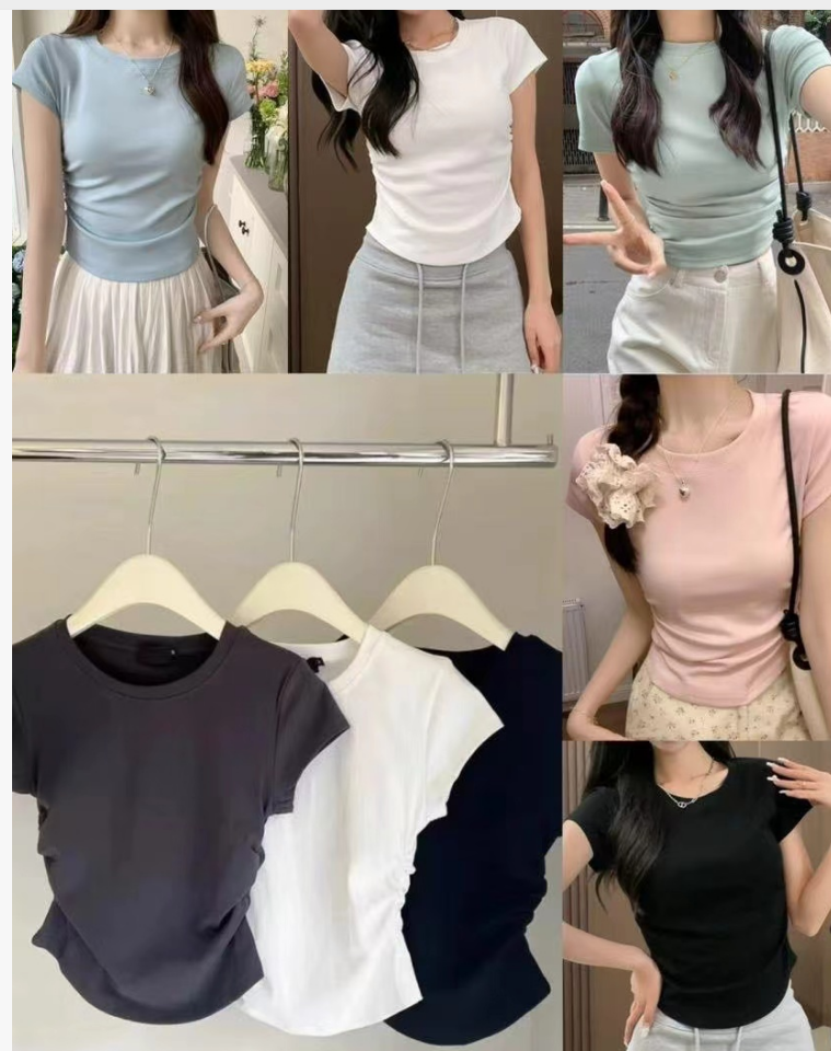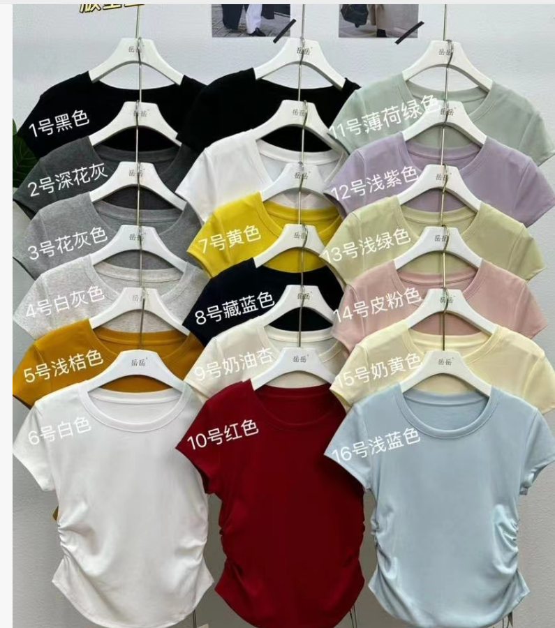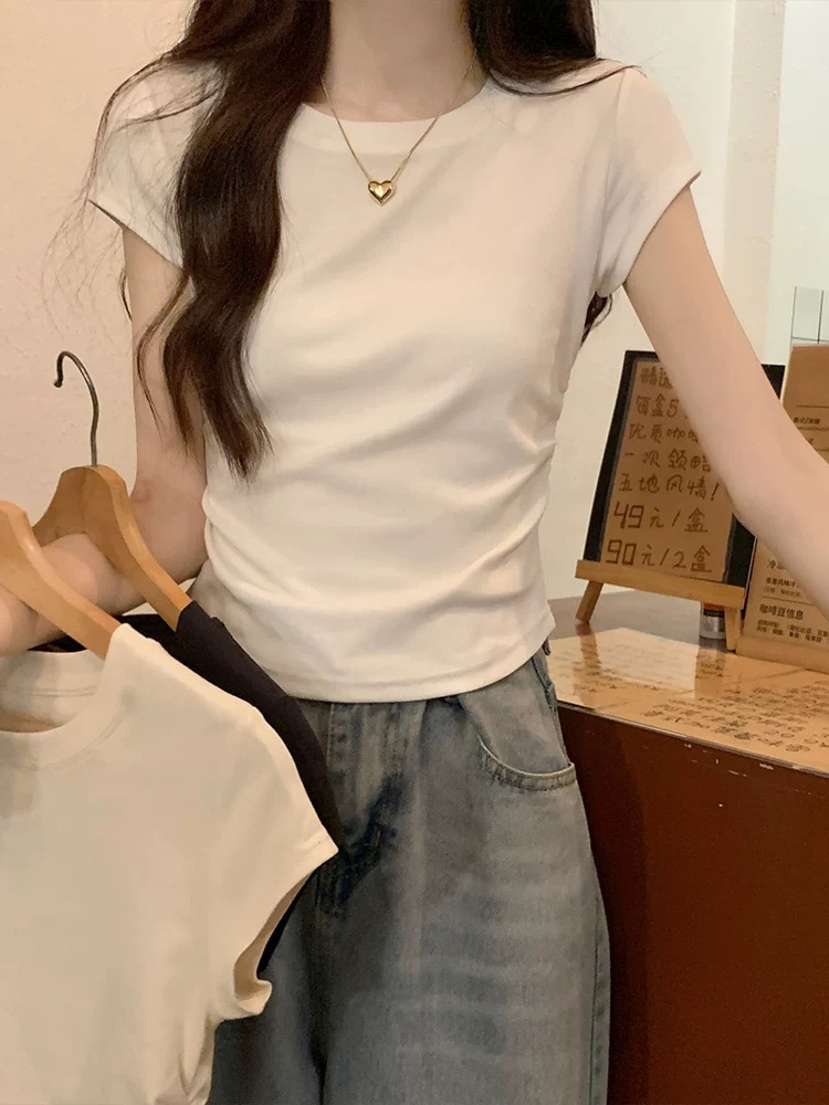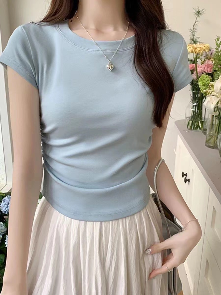 【GZ】无忧购26年春夏正肩短袖T收腰褶皱显瘦圆领短袖T恤3019(现货48小时发货)
