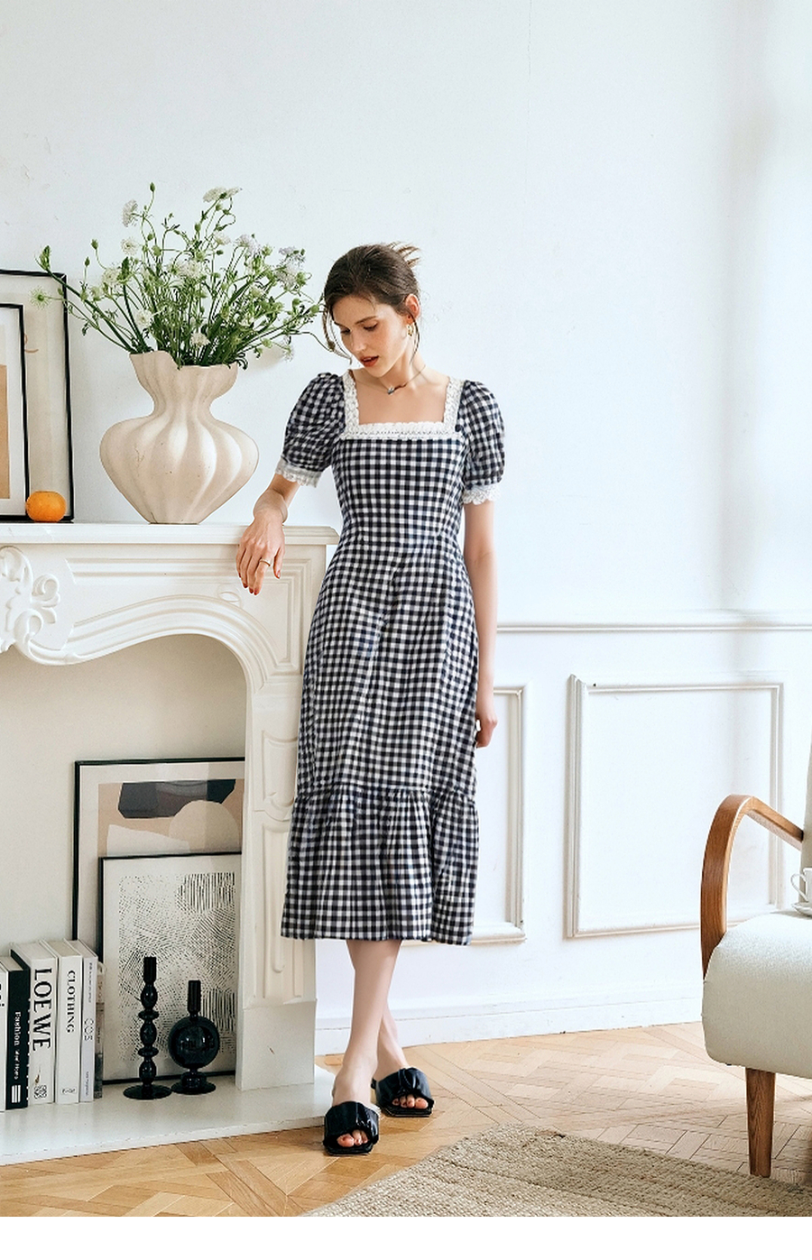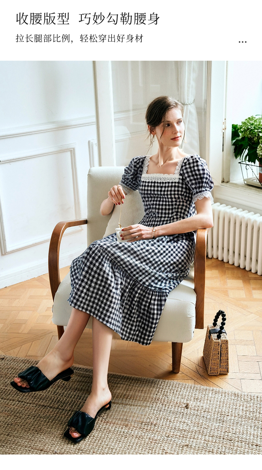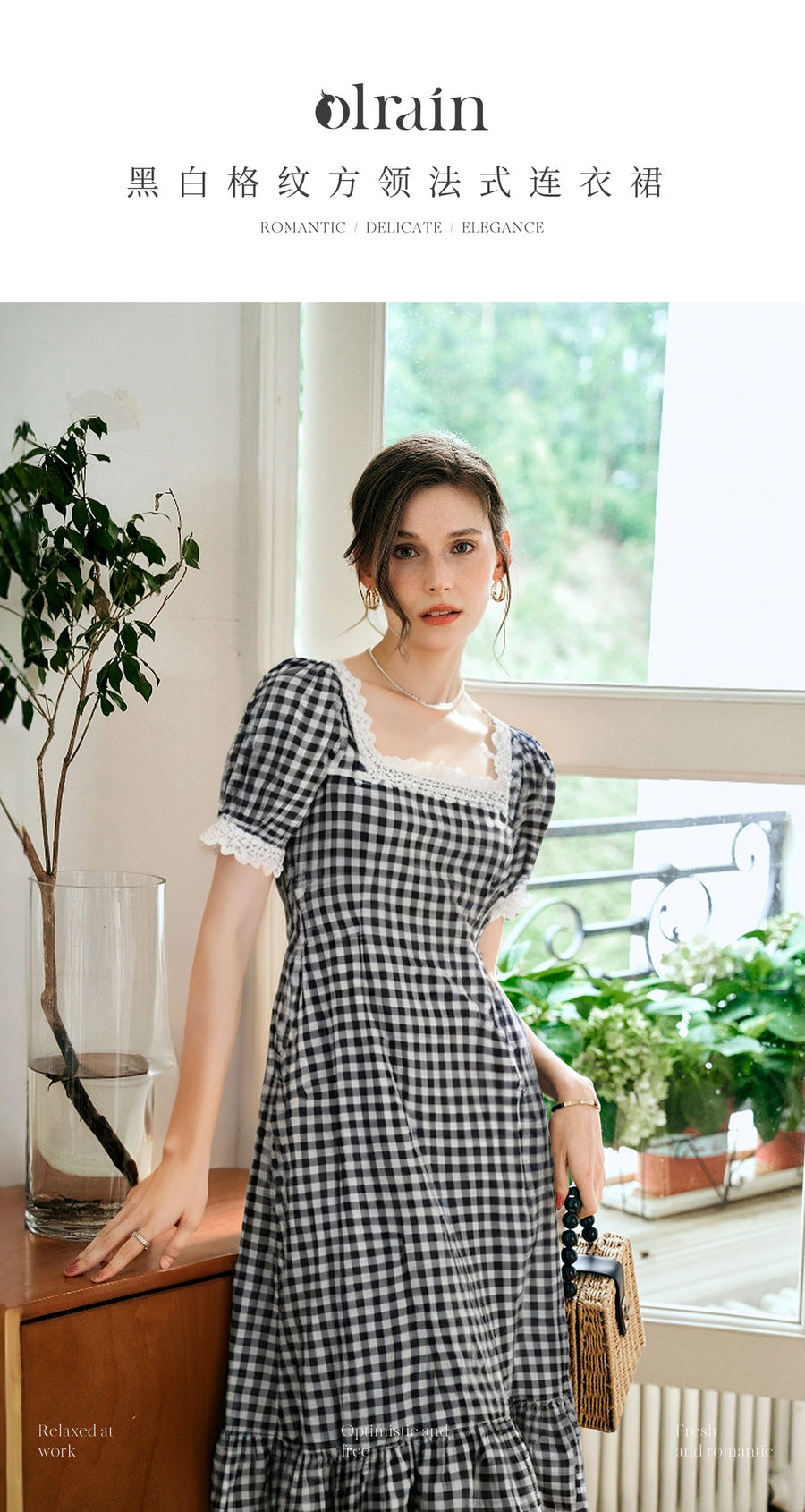 OLrain欧芮儿黑白格纹方领法式连衣裙女夏季2025新款泡泡袖长裙子