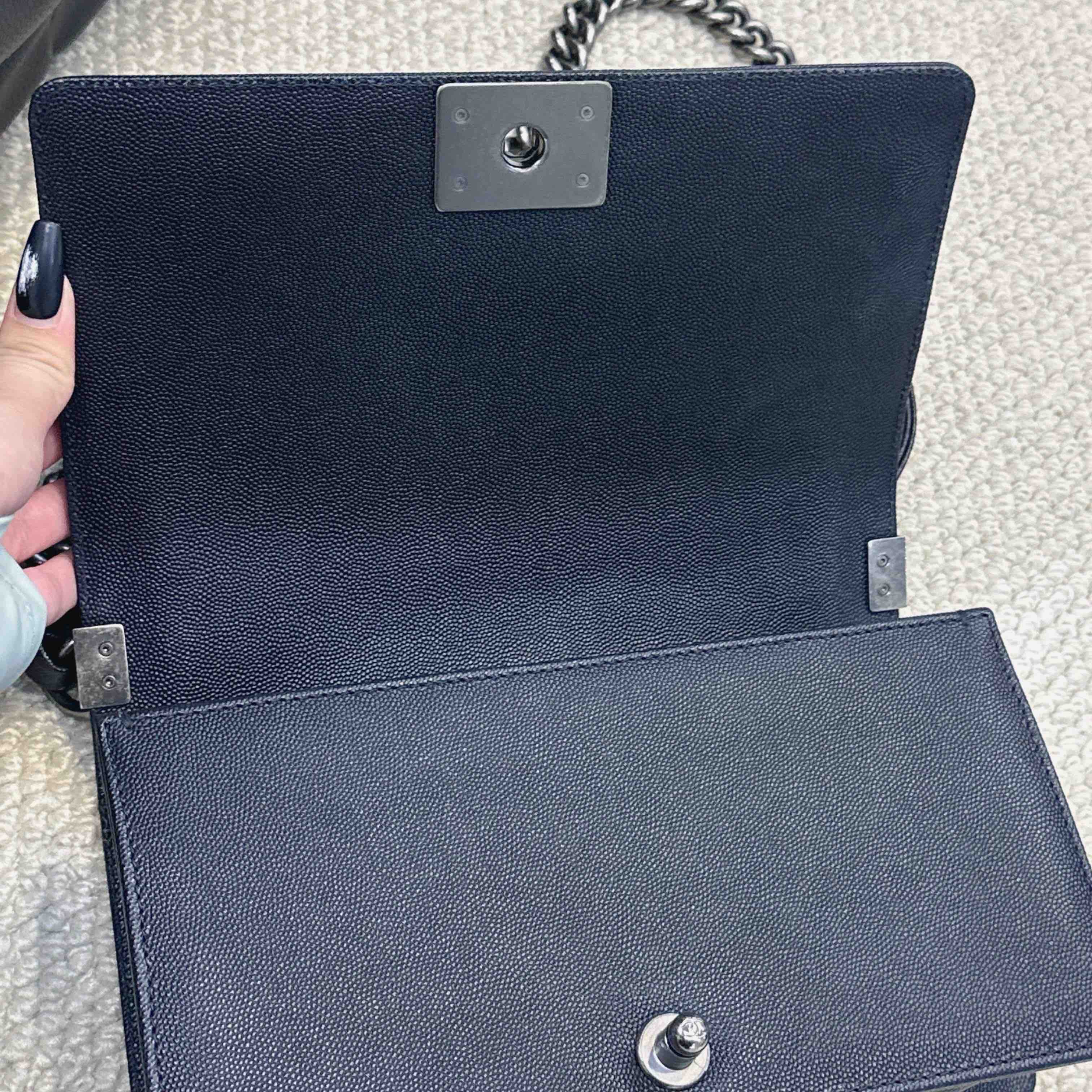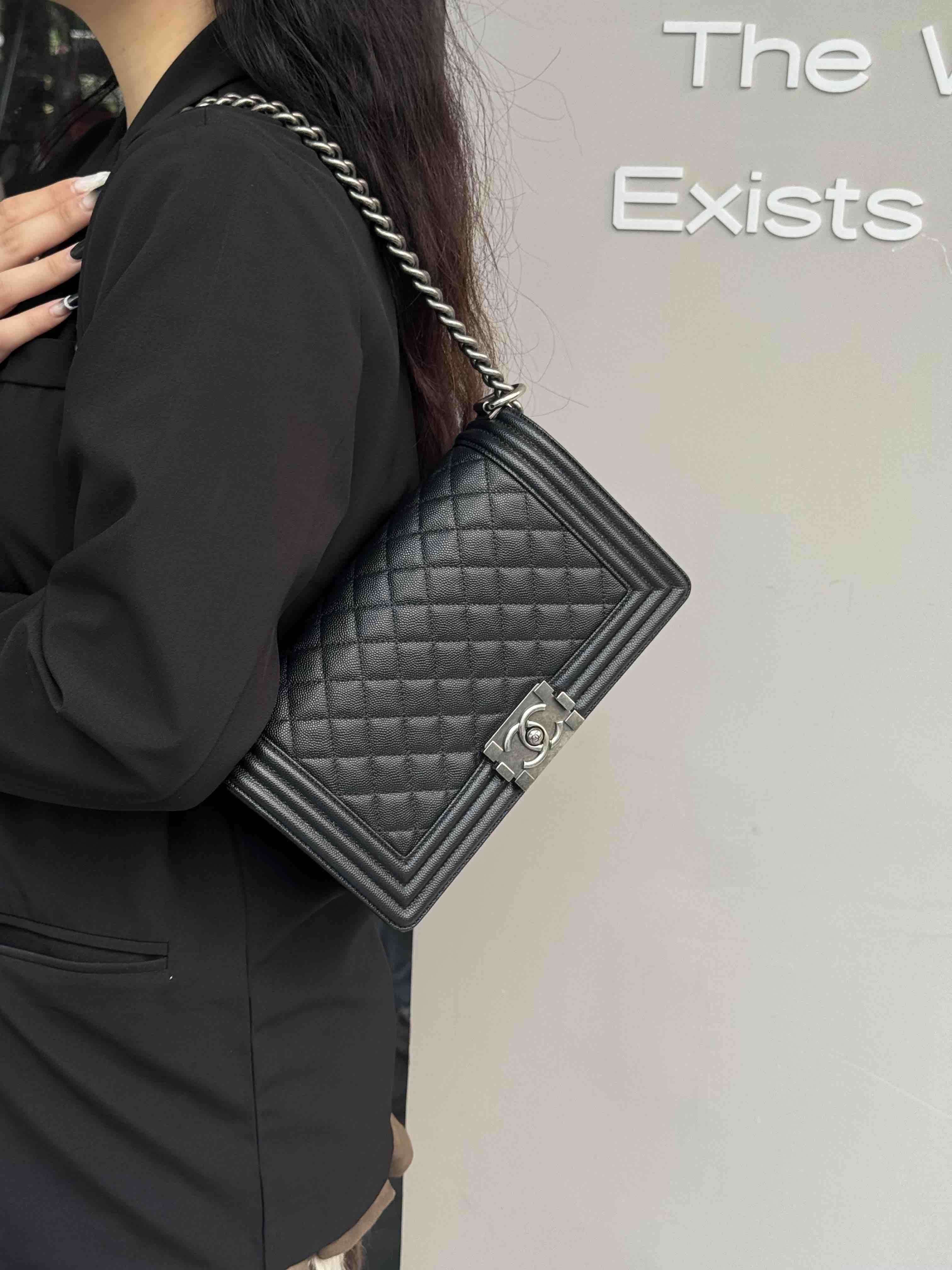 【商品详情】 正品二手 Chanel leboy 中号黑银 荔枝皮 斜挎包🪞 98新 25×15 镭射29开 配件:卡 票 说明书 盒子。边角轻微使用感。经典贵气