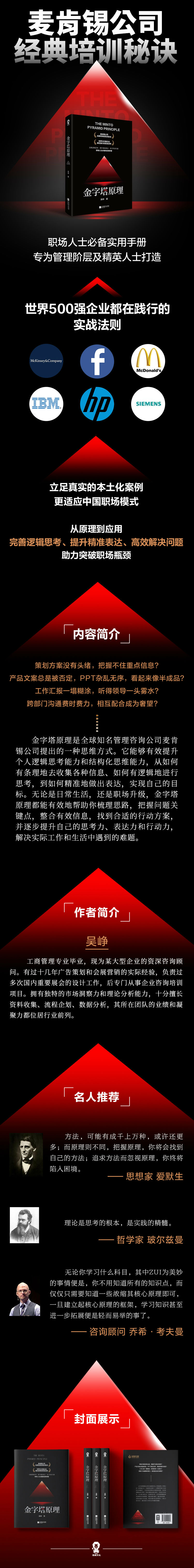 像林青的第YI封邮件一样,诸如此类的思维陷阱还有很多,它们让我们的表达看似有条理实质上却十分混乱,对于读者或听众来说难以理解。幸好思维能力是可以学习和培养的,一个简单、有效的梳理思路的方法就是把思维整理成金字塔结构。林青修改后的邮件便应用了金字塔结构。将核心观点放在ZUI前面,是金字塔原理的基本规则之一——以上统下,即上一层次的观点和思想是下一层次的统帅,下一层次的观点和思想是上一层次的支撑,由此形成一个下大上小的稳固的金字塔结构。我们的思维便在这样的结构中变得清晰起来。