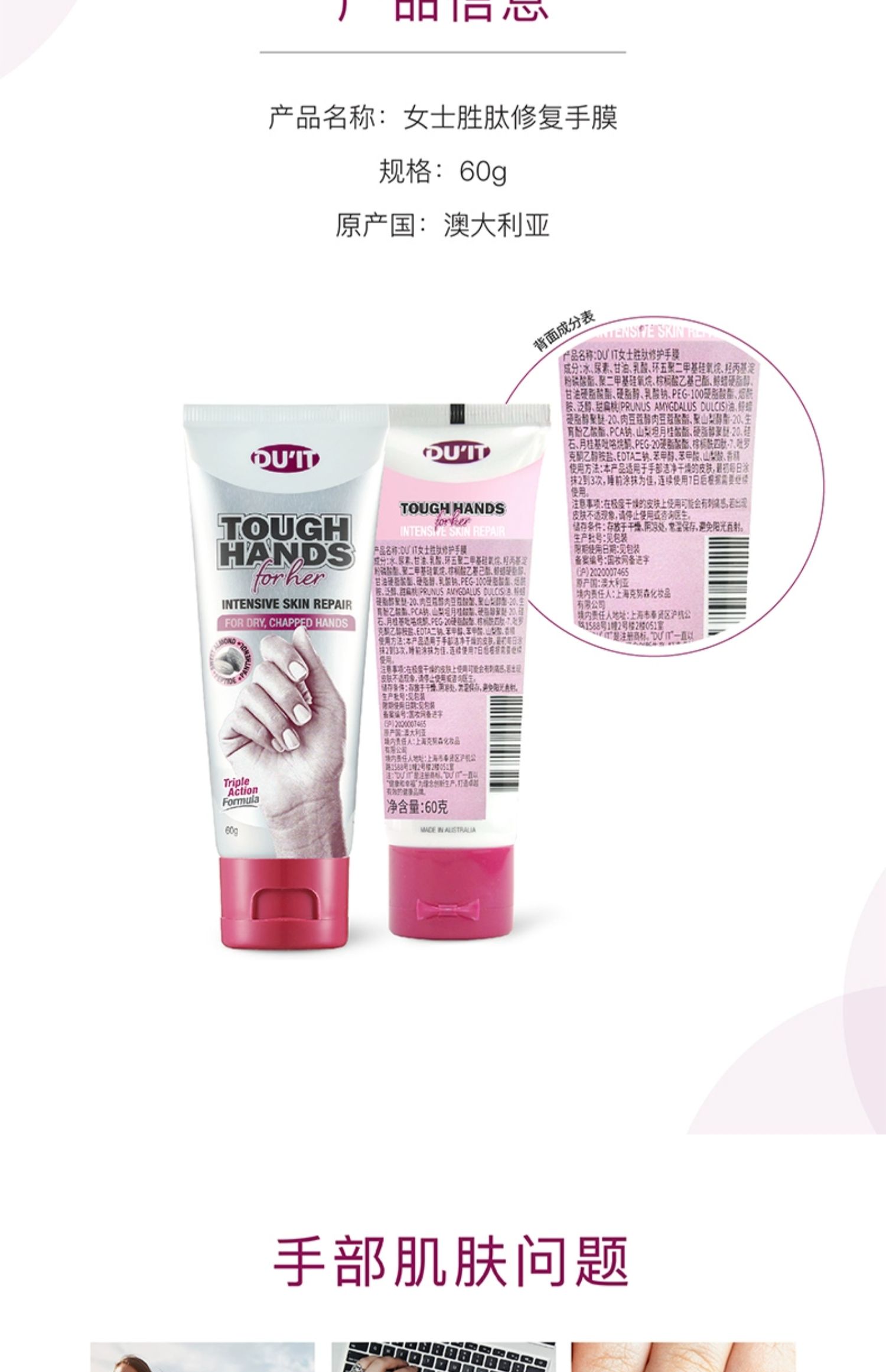 DUIT女士胜肽修护手膜60g/117775 滋润保湿补水长效修复手膜烟酰胺防干裂霜