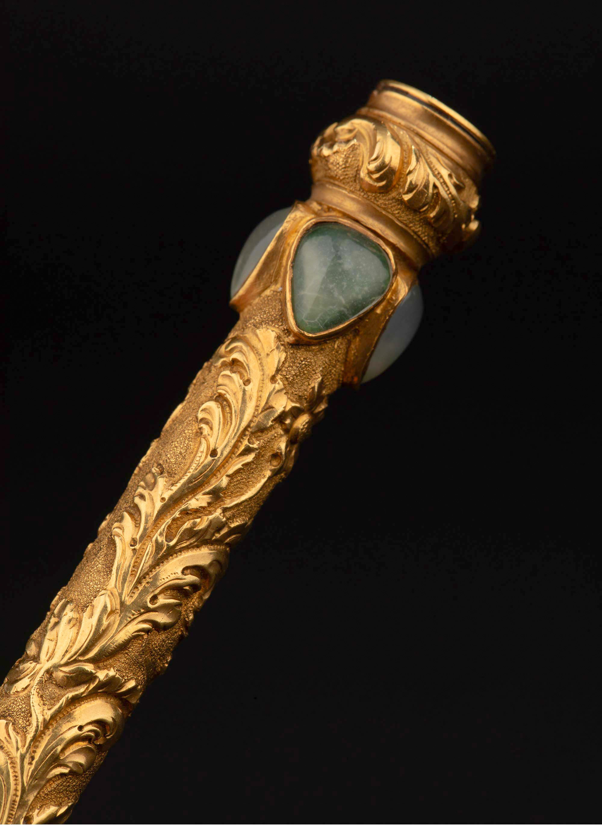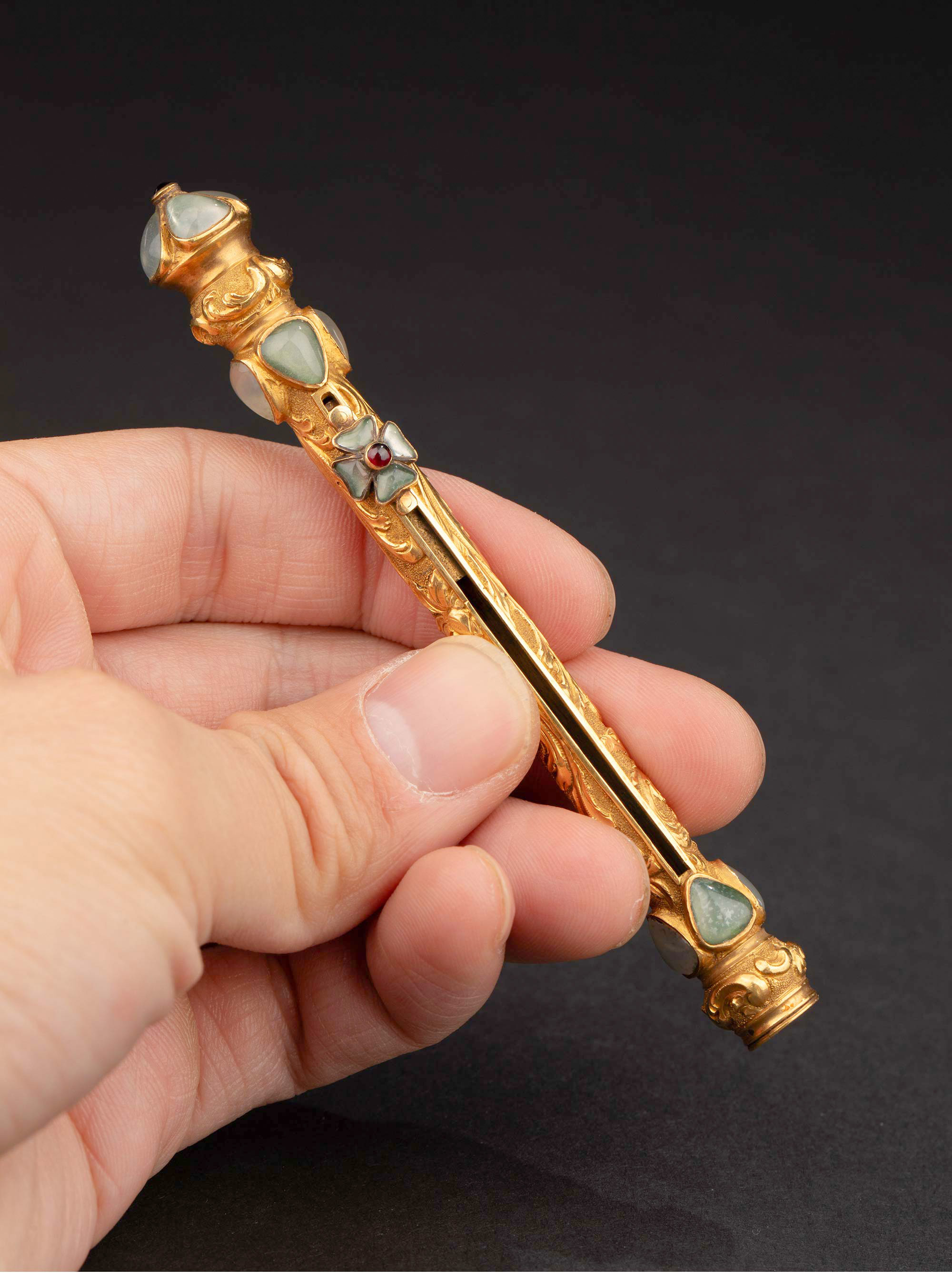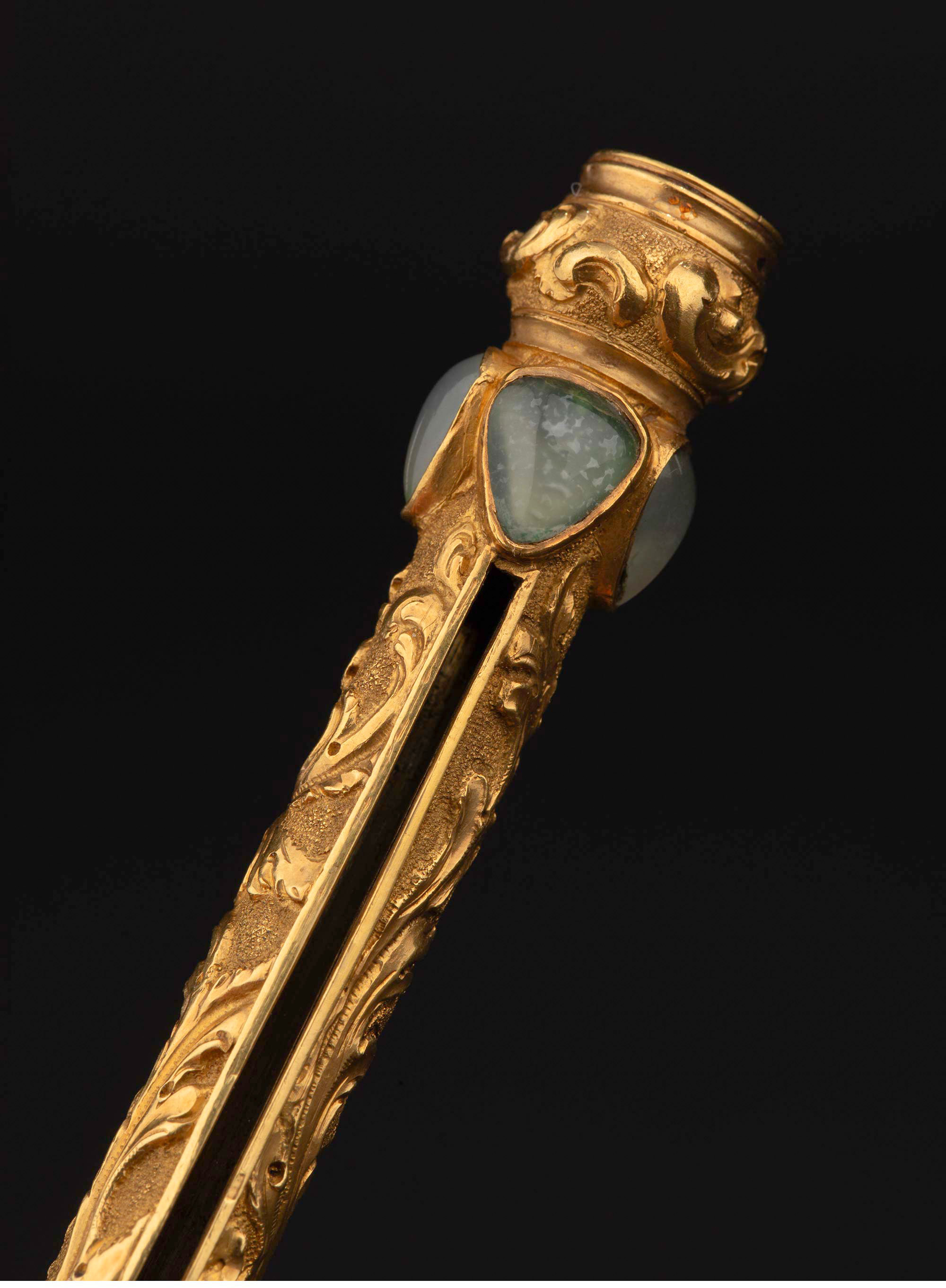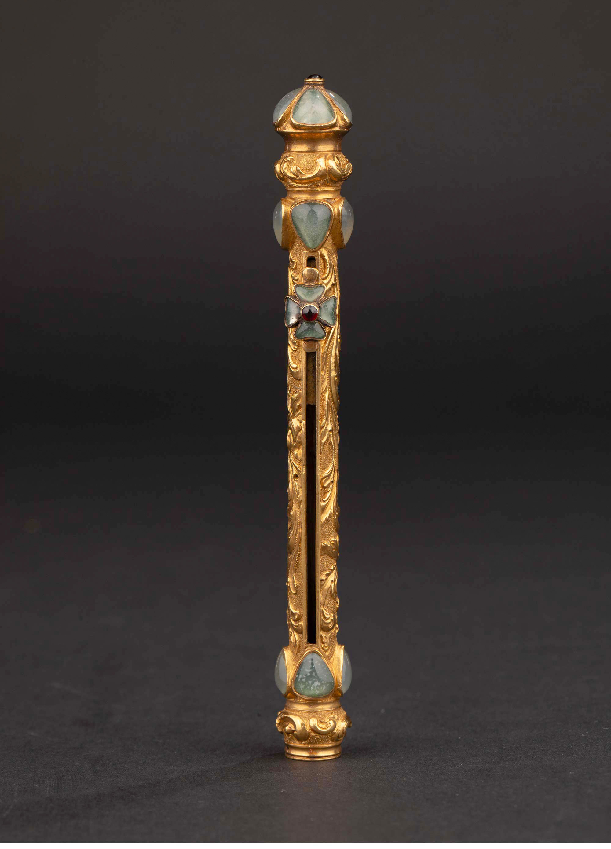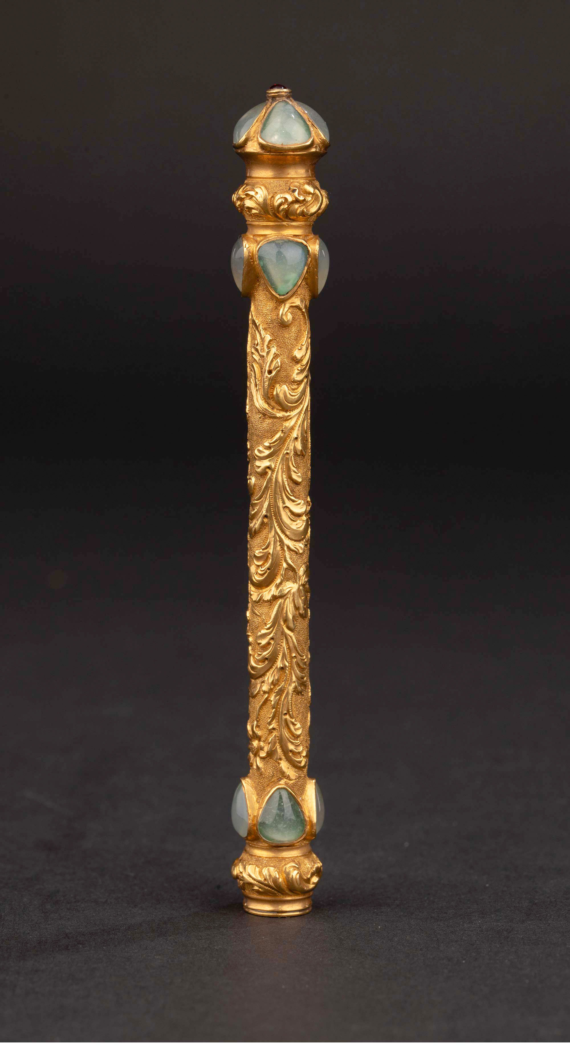 1860-1870年代欧洲出品洛可可风格月光石及红宝石镶嵌花叶纹18K黄金精雕铅笔杆