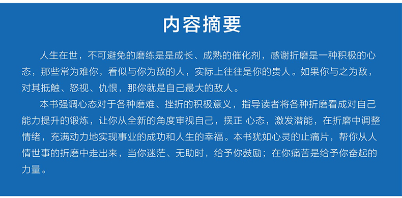 《感谢折磨你的人:自己是的敌人 第2版》强调心态对于各种磨难、挫折的积极意义,指导读者将各种折磨看成对自己能力提升的锻炼,让你从全新的角度审视自己,摆正心态,激发潜能,在折磨中调整情绪,充满动力地实现事业的成功和人生的幸福。《感谢折磨你的人:自己是的敌人 第2版》犹如心灵的止痛片,帮你从人情世事的折磨中走出来,当你迷茫、无助时,给予你鼓励;在你痛苦时给予你奋起的力量。人生在世,不可避免的磨练是成长、成熟的催化剂,感谢折磨是一种积极的心态,那些常为难你,看似与你为敌的人,实际上往往是你的贵人。如果你与之为敌,对其抵触、怒视、仇恨,那你就是自己的敌人。