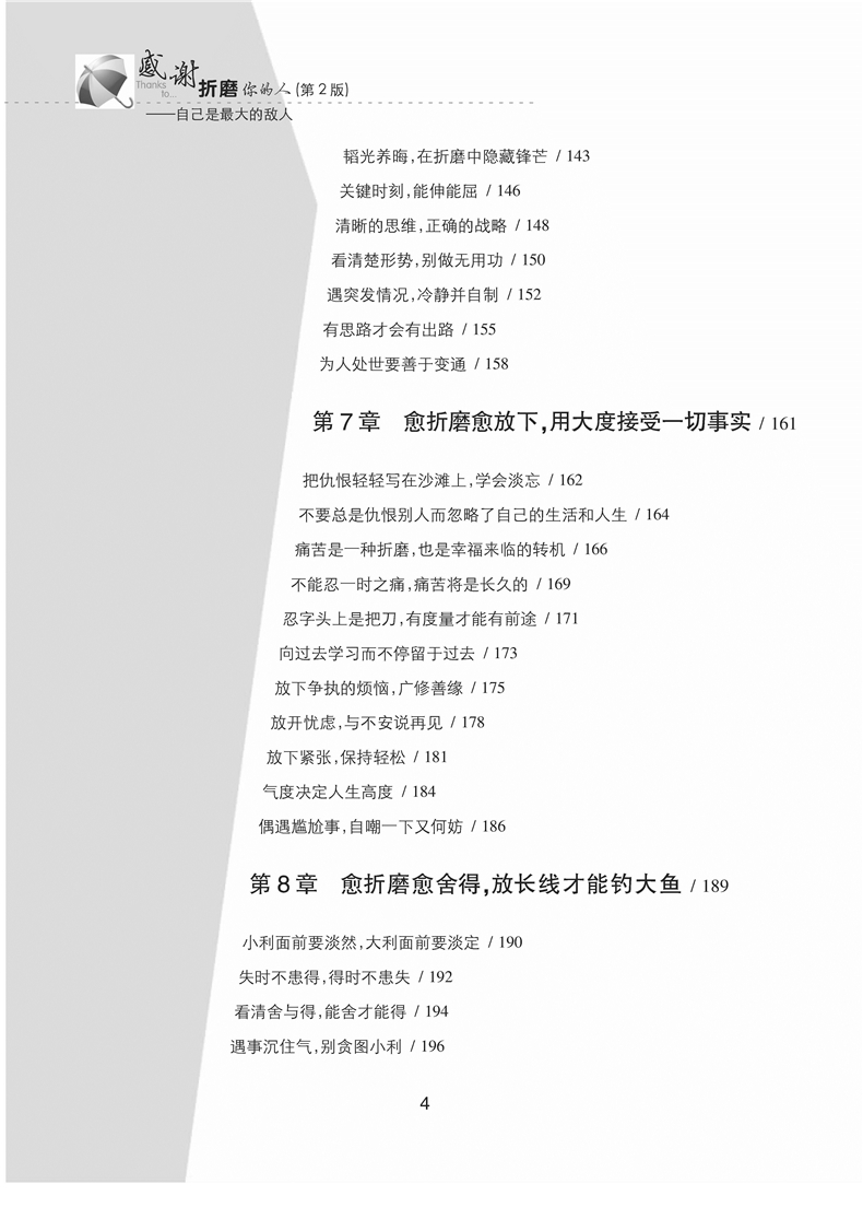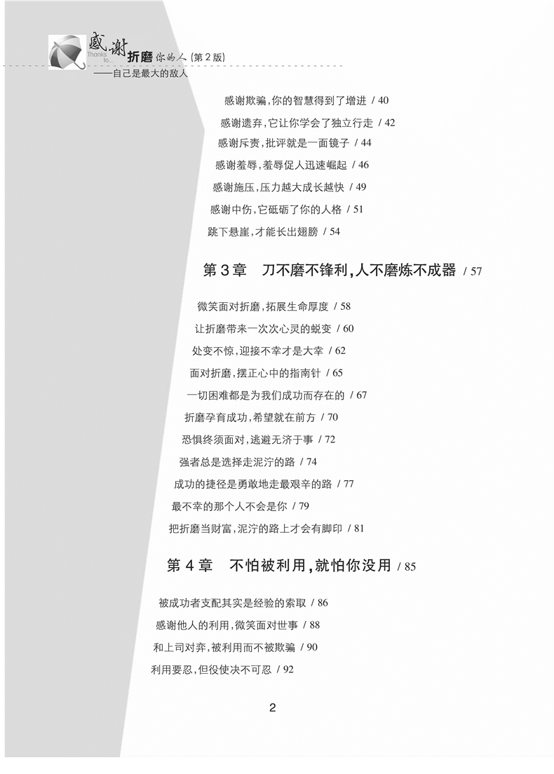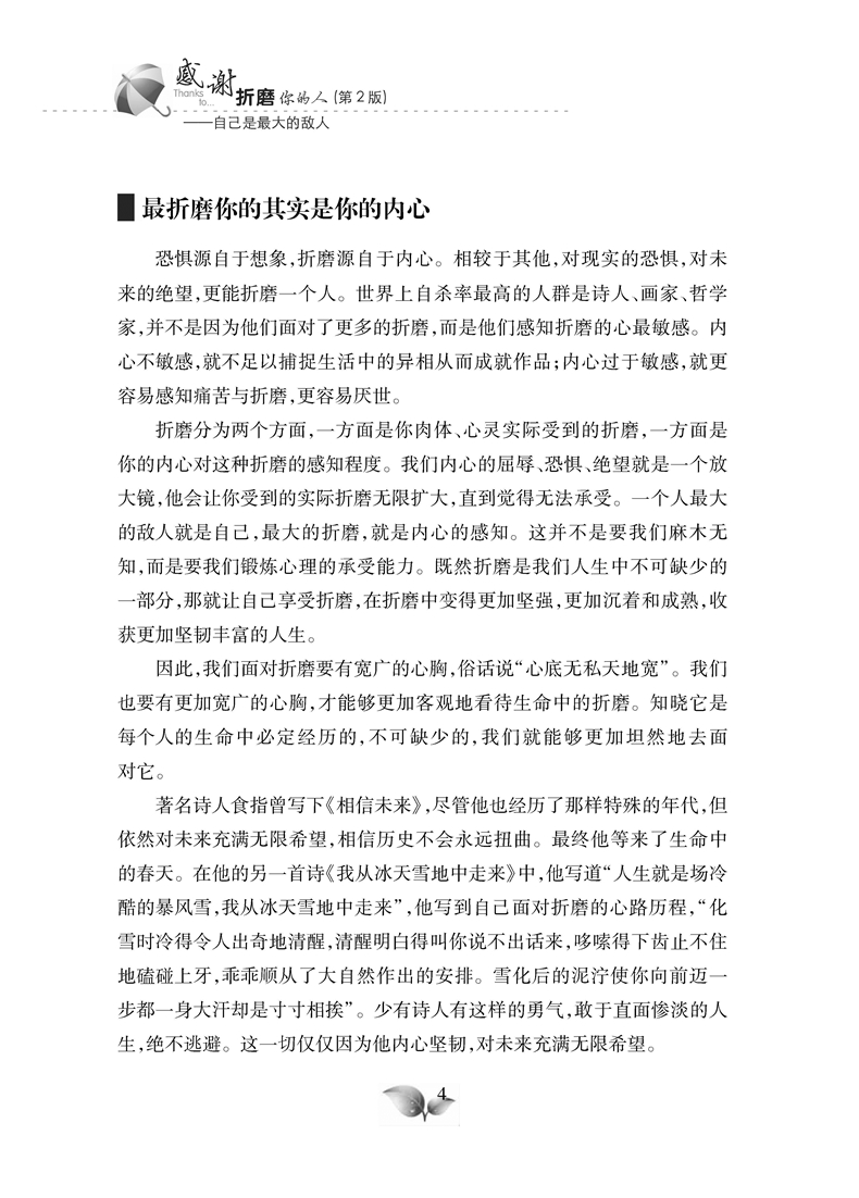 《感谢折磨你的人:自己是的敌人 第2版》:不磨不锋利,人不磨不争气,能够战胜自己的人,折磨无处不开怀。常常为难你,看似与你为敌的人,实际上往往是你的贵人。如果你与之为敌,对其抵触、怒视、仇恨,那你就是自己的敌人。被别人折磨是一种成长,被自己折磨则是一种愚行。承受各种苦难,才能拓展生命的张力.一次次的折磨,让你更坚强,让生命更昂扬,让人生更嘹亮!
