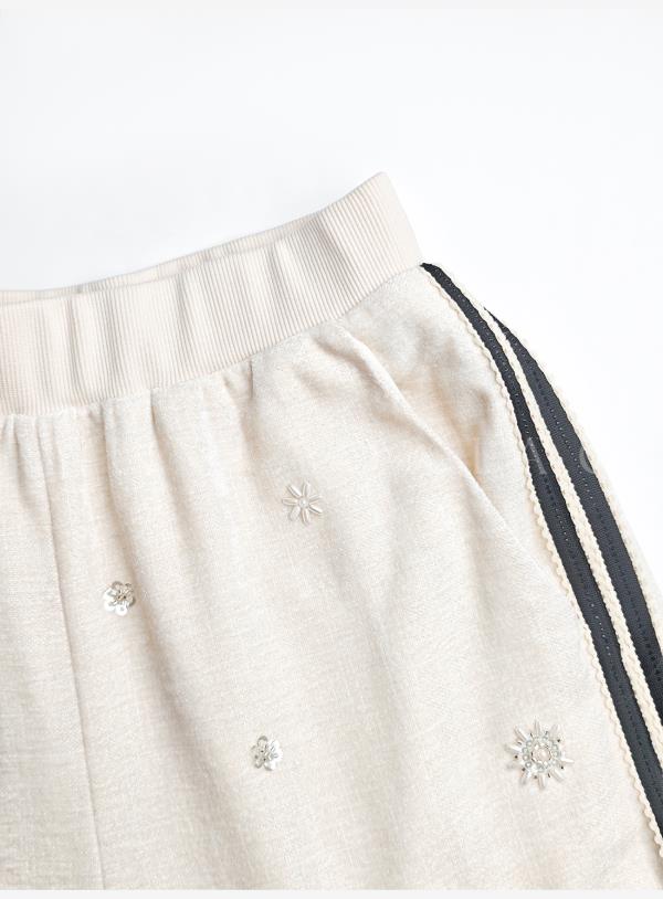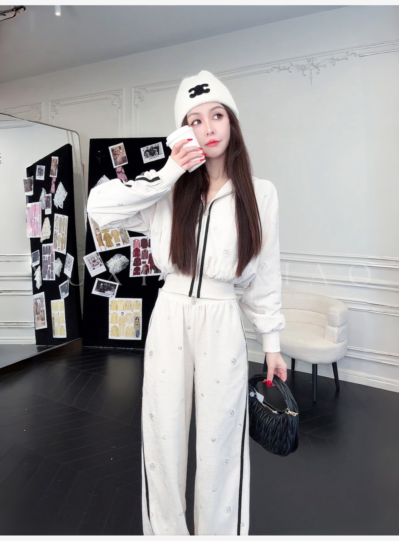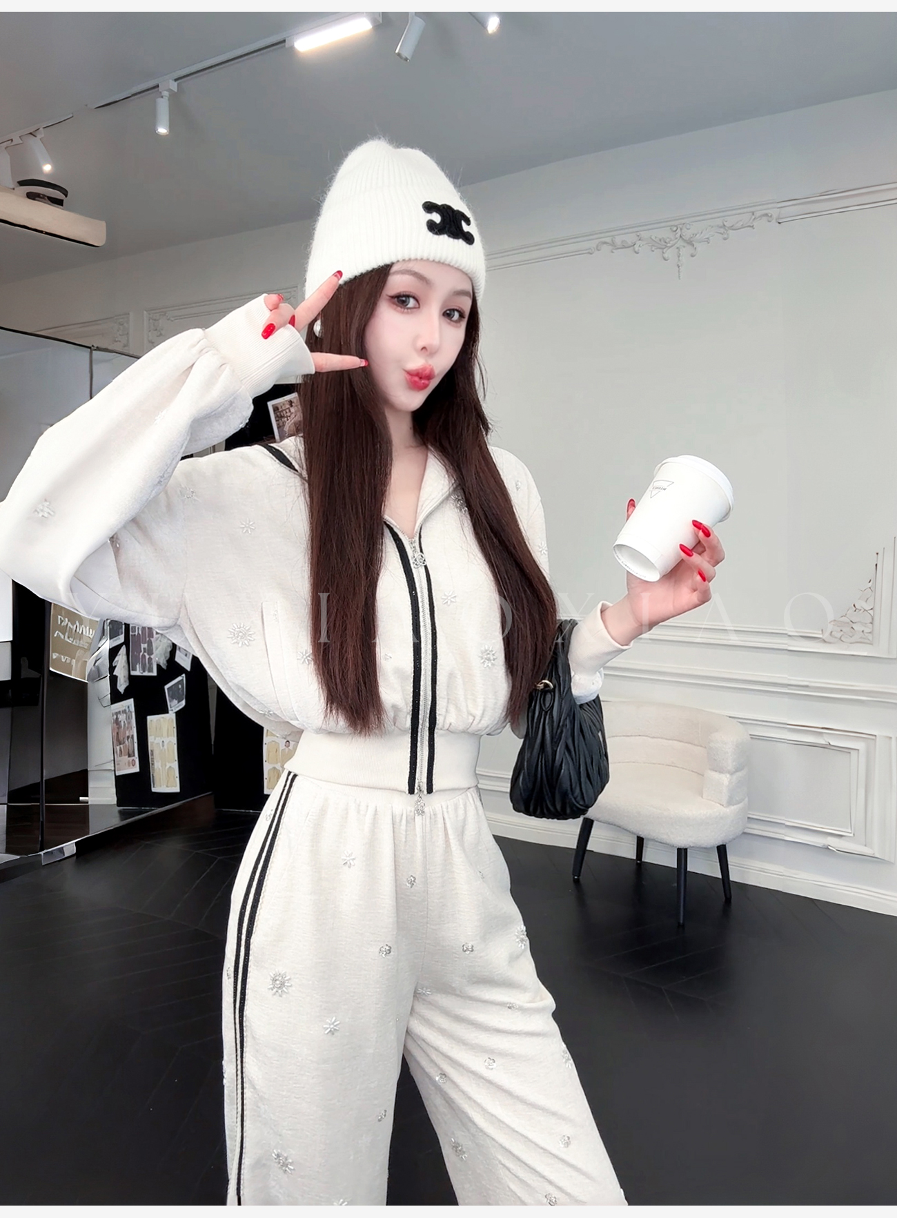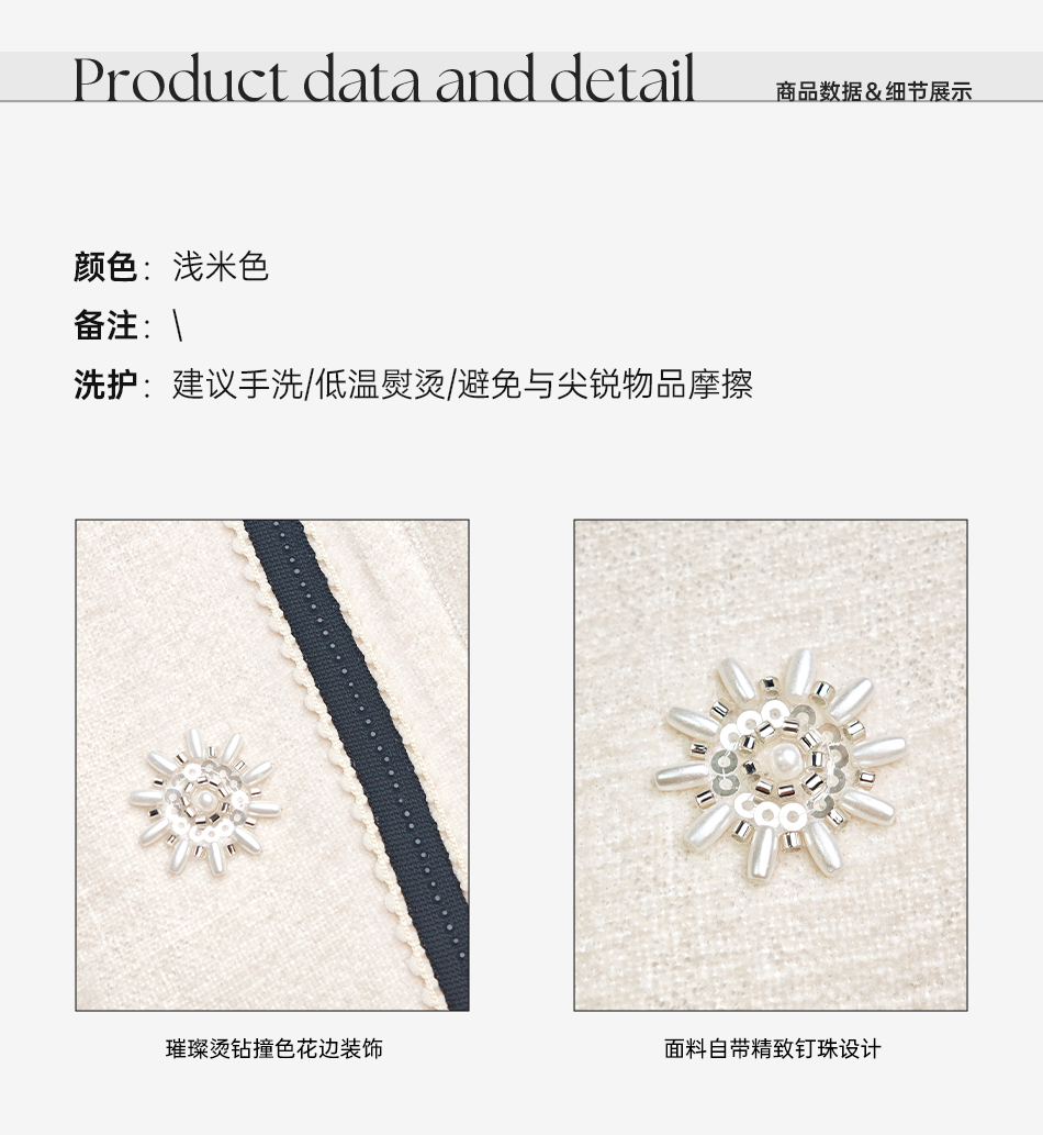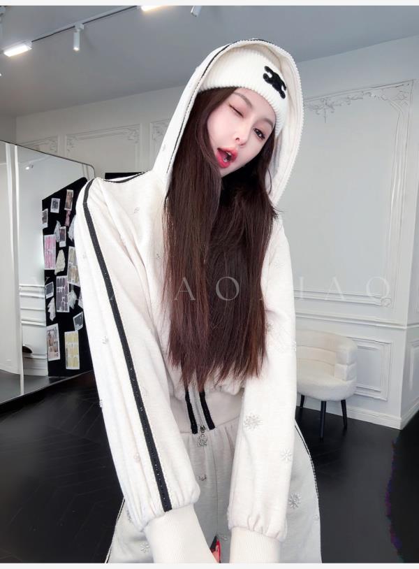 余潇潇【花语随行】时尚舒适独特绒感烫钻撞色花边拼接套装2025秋冬