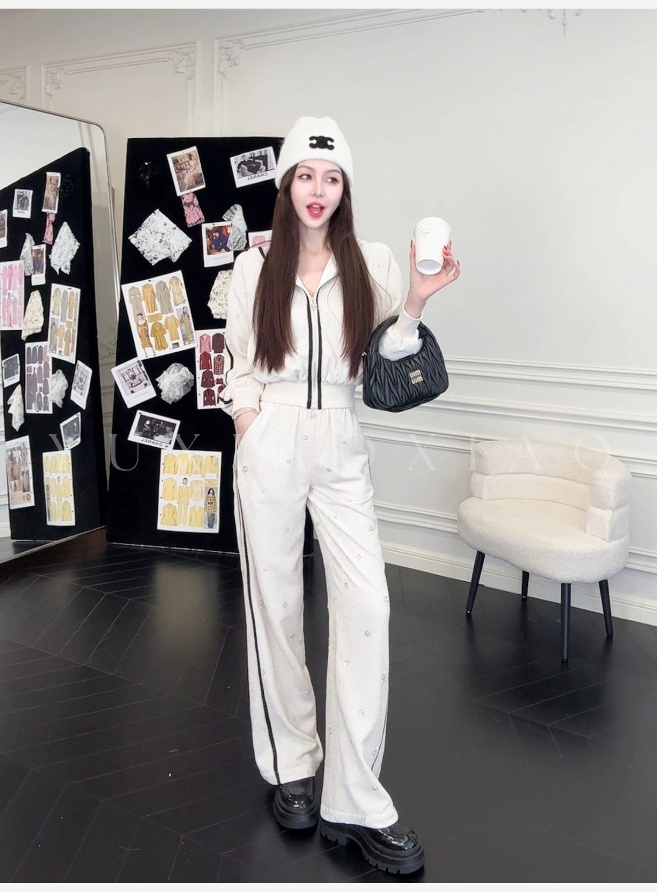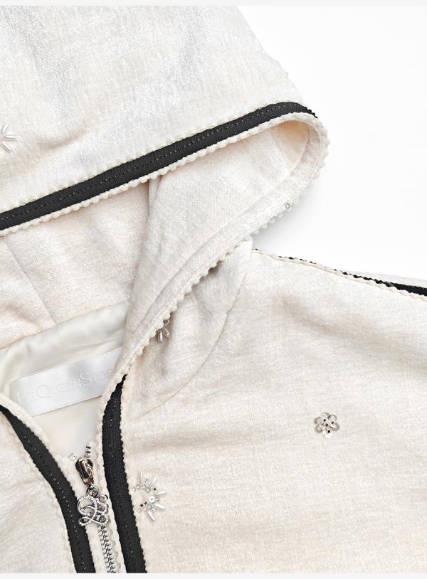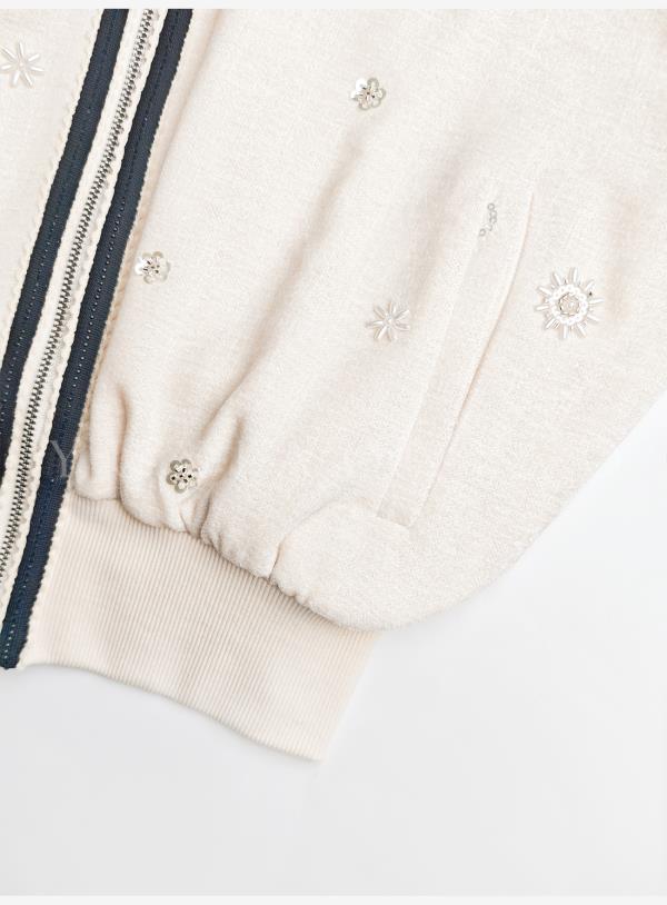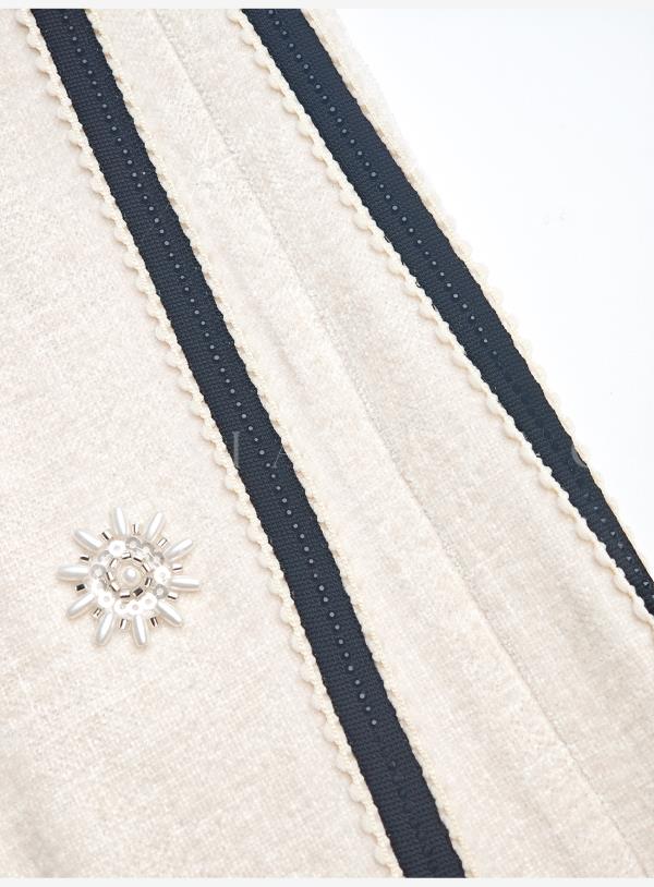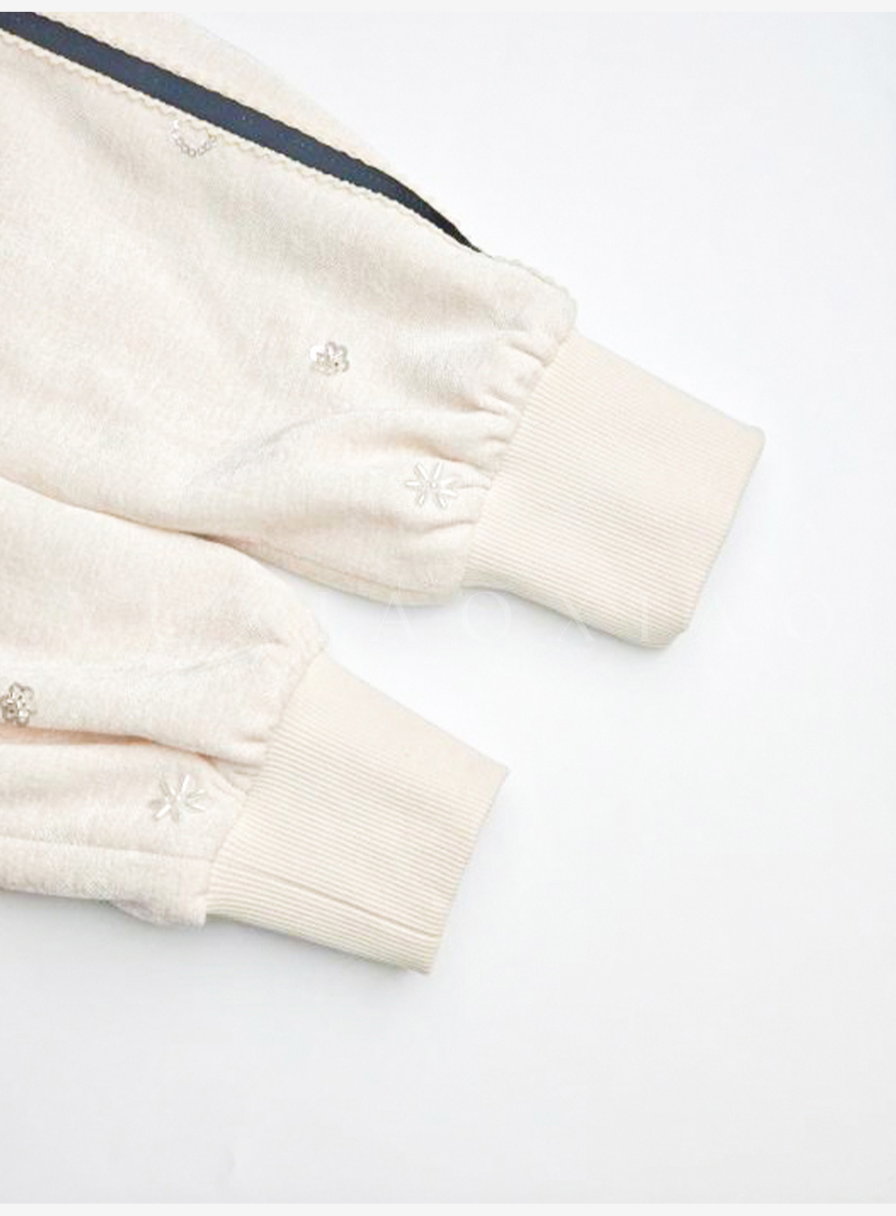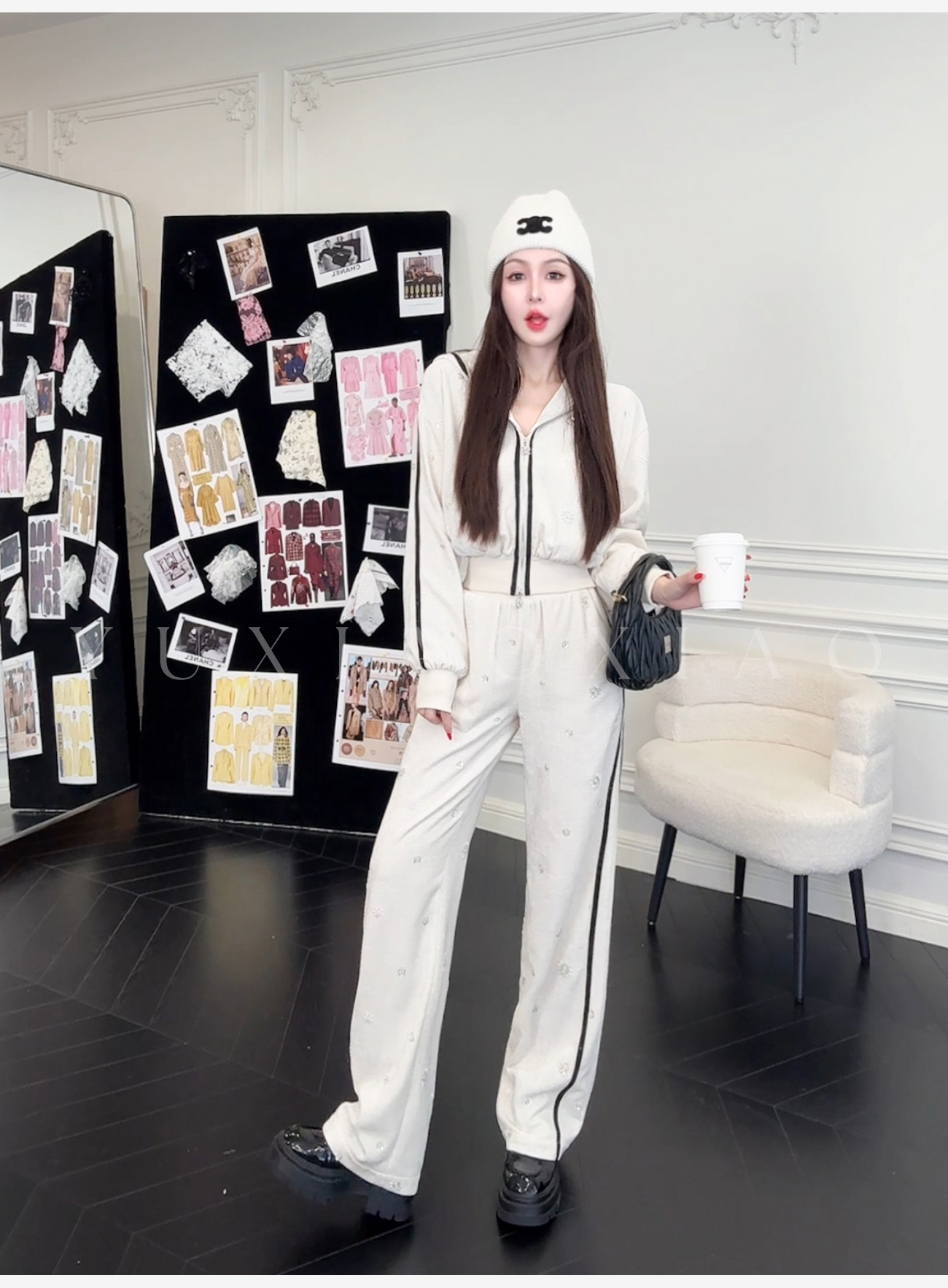 余潇潇【花语随行】时尚舒适独特绒感烫钻撞色花边拼接套装2025秋冬