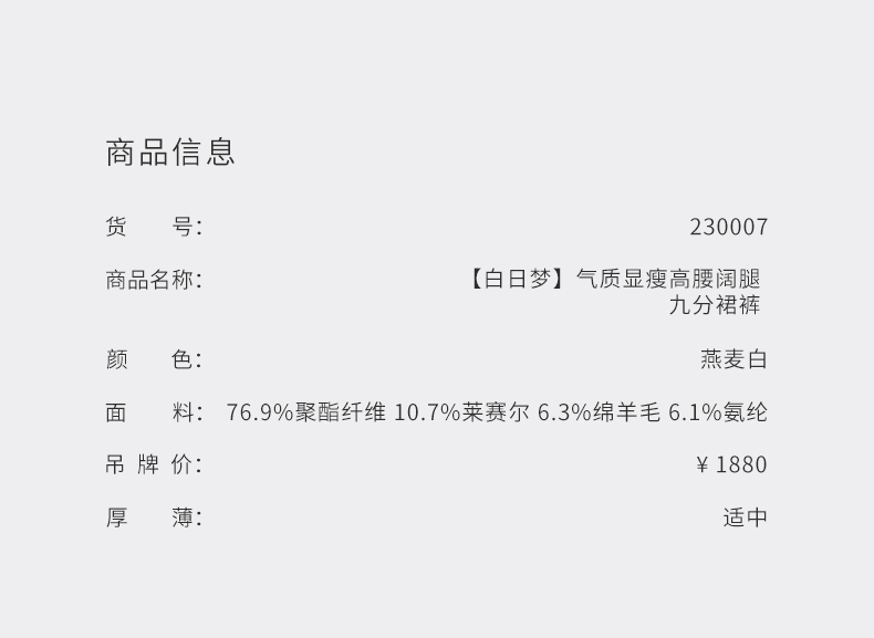 【白日梦】气质显瘦高腰阔腿九分裙裤/230007