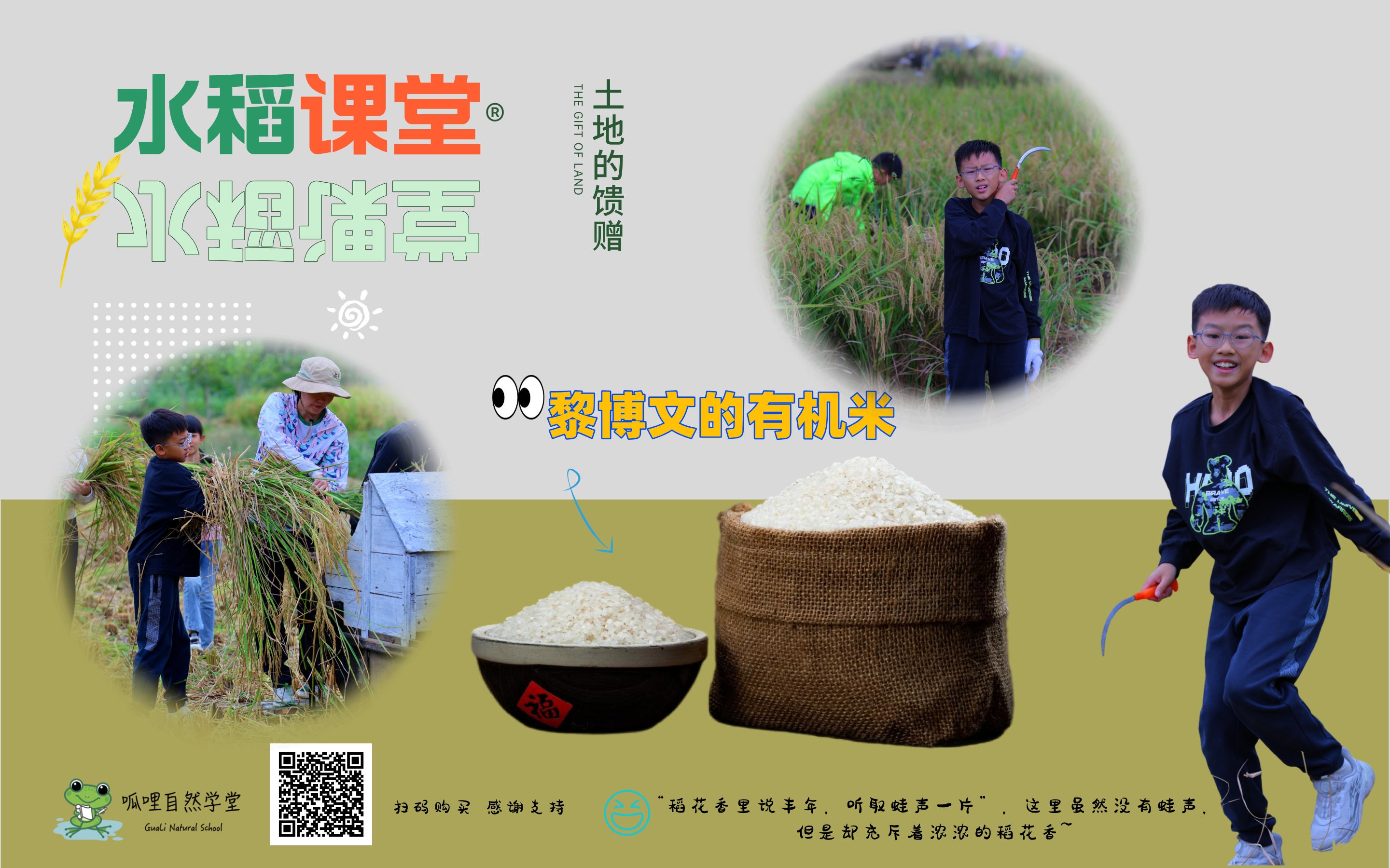 这就是我们的大米,有记忆的大米,有故事可以说给你听的大米。如果你恰好路过这里,不妨听一下我们的故事,每一个孩子都把他们与大米的故事做成了视频,也将他们亲自种出的大米分装成礼物的样子,期待与你分享。