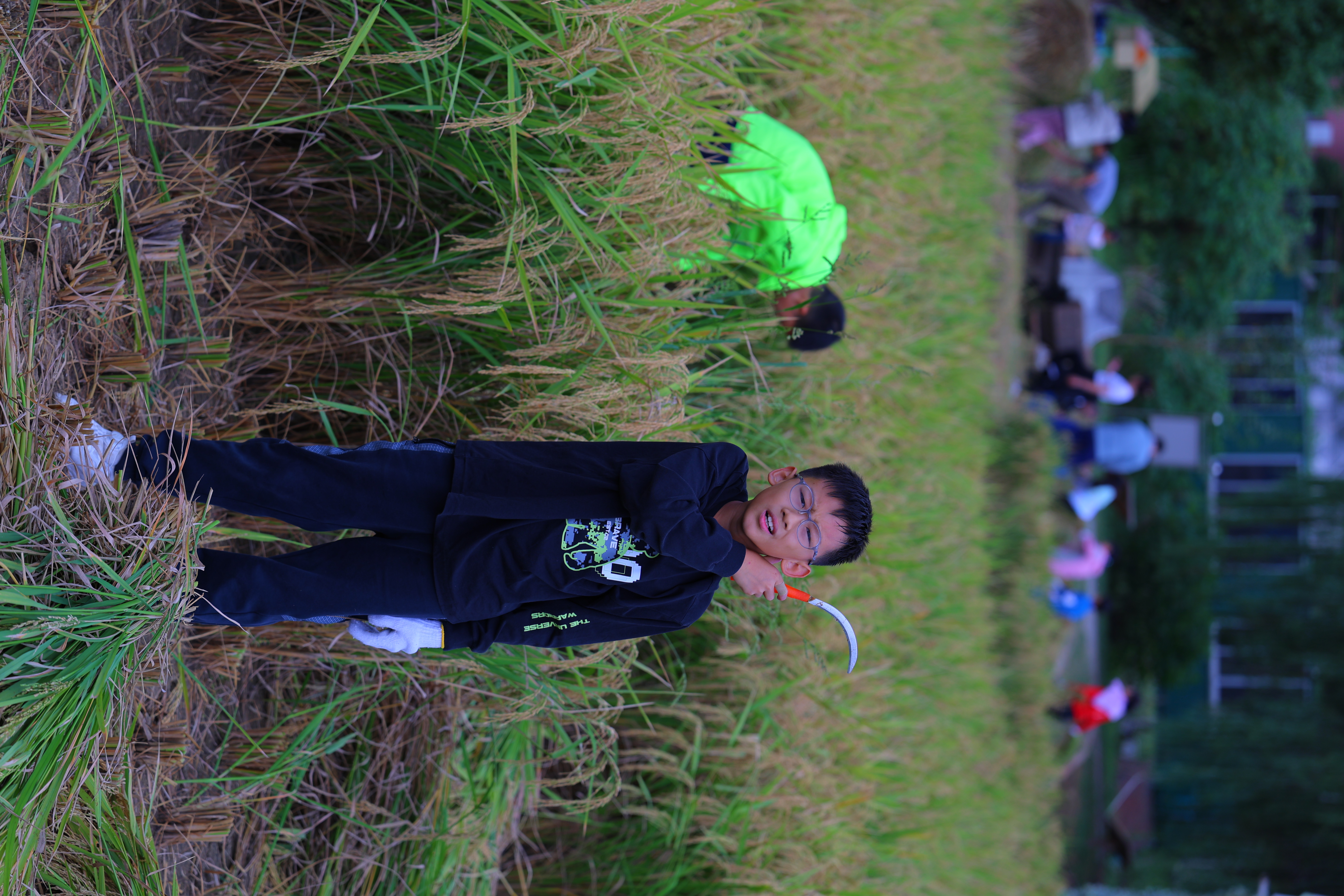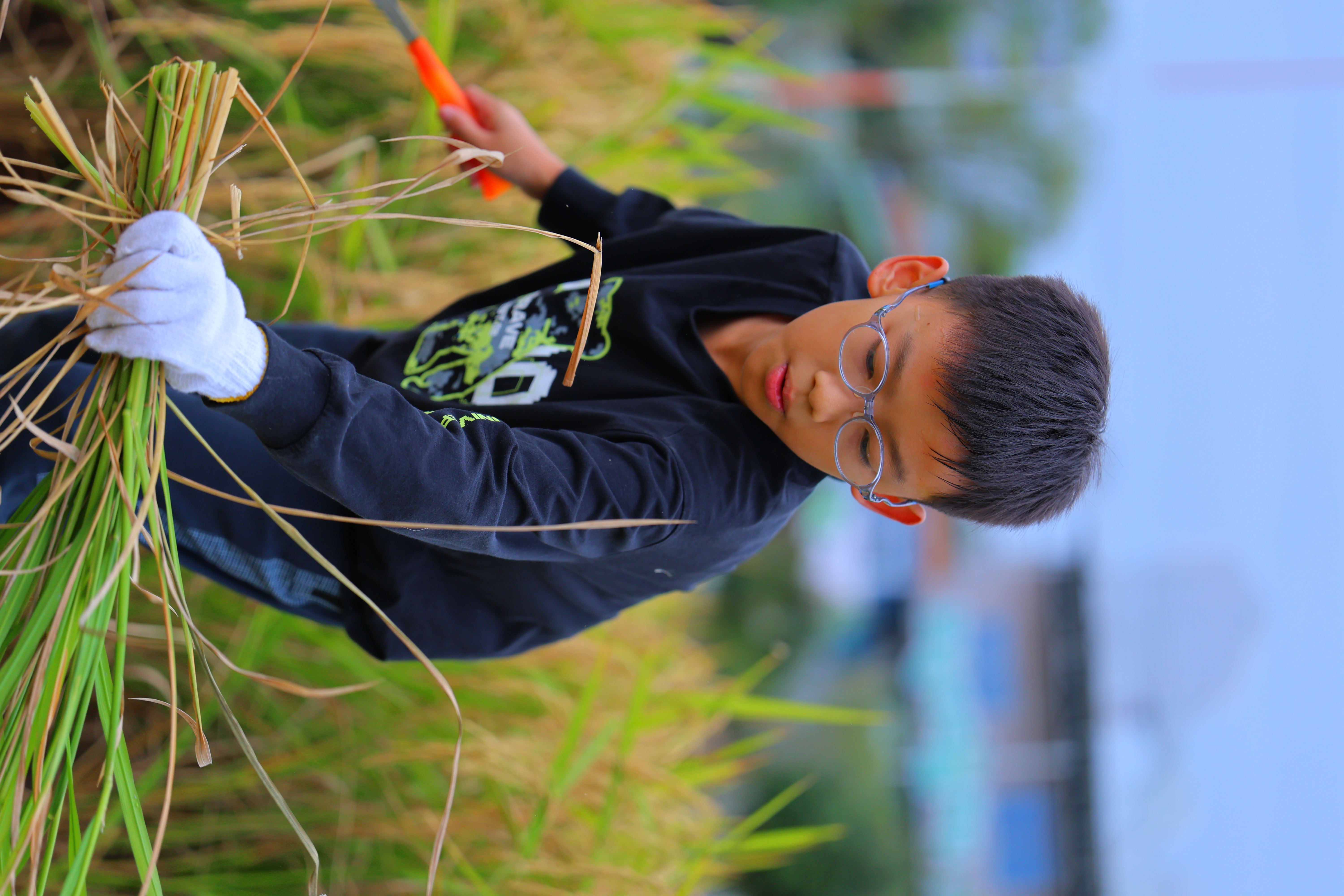 十月,稻谷们终于等来成熟的讯息,也等来了久违了的小主人们。重逢是多么亲切呀,孩子们抚摸着沉甸甸的稻穗,稻穗在风中翩跹回应。孩子们花了整整两天时间收割稻谷,累了,就躺倒在一摞摞的稻草堆上,他们望向天空,望向被自己收割完的田地,再望向麻袋里沉甸甸的稻谷,脸上洋溢着满足的笑意。