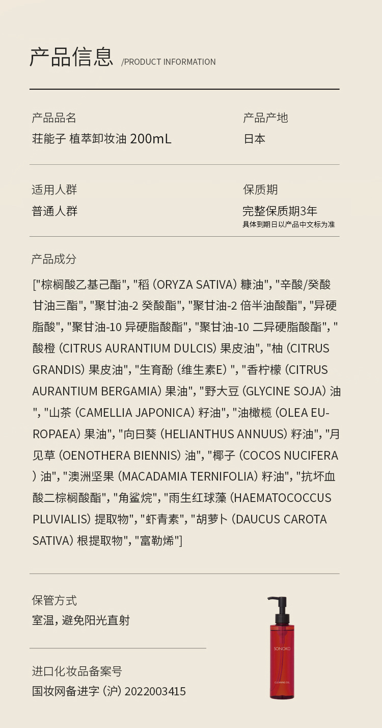 【特卖】银座SONOKO荘能子 植萃卸妆油 200mL 无水无防腐剂 富勒烯配合
