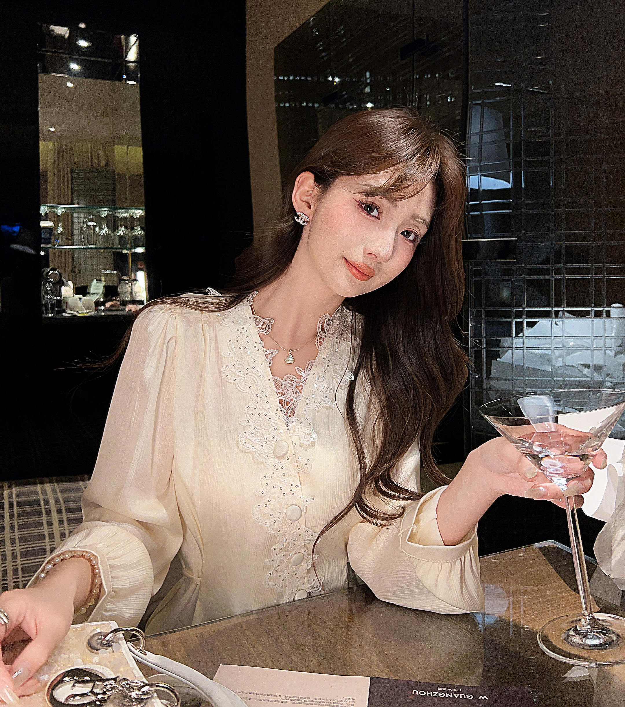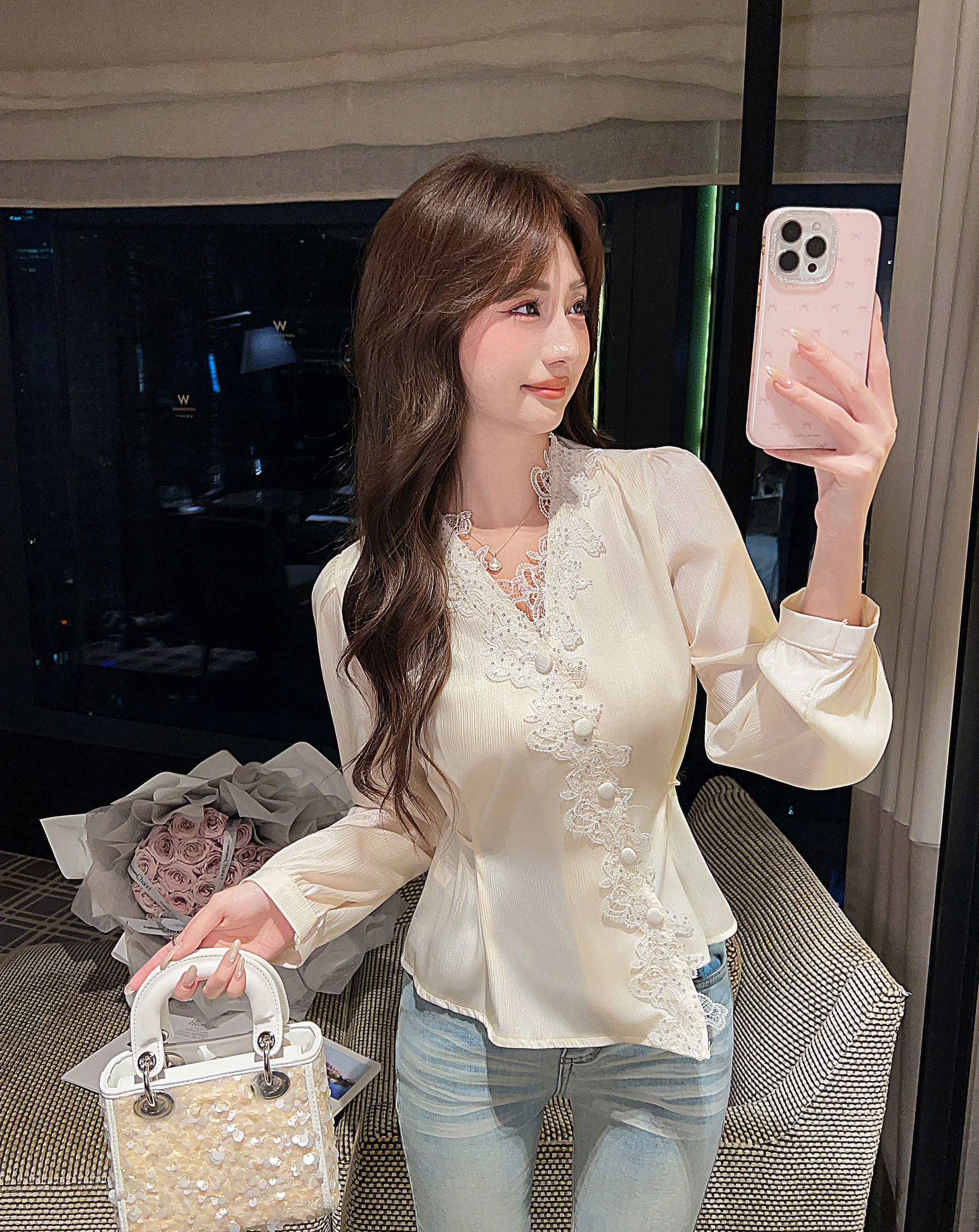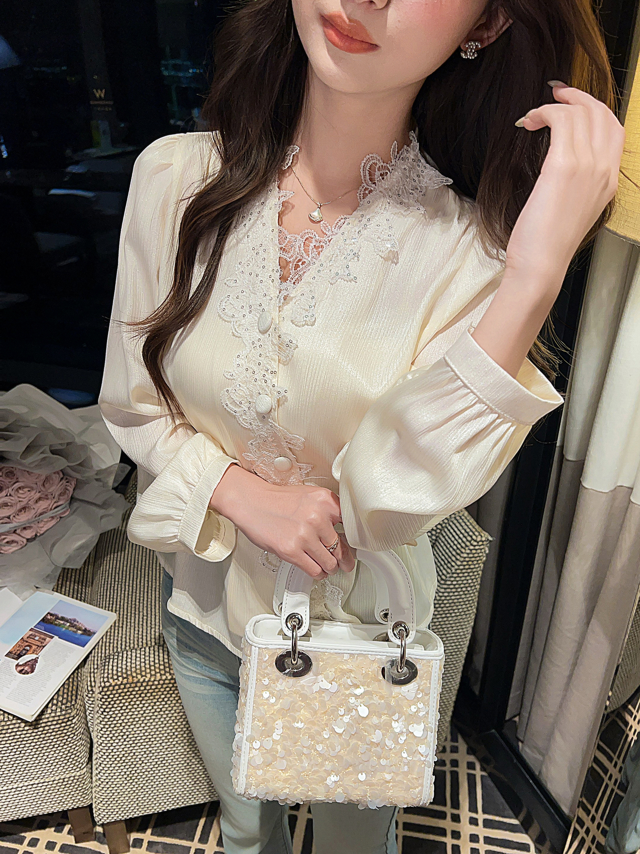 张心子【香榭琉光】法式小资V领收腰缎面衬衫女春季新款独特上衣 U2602079