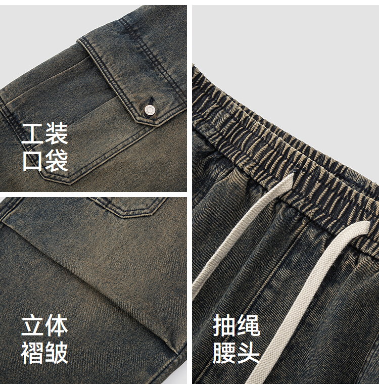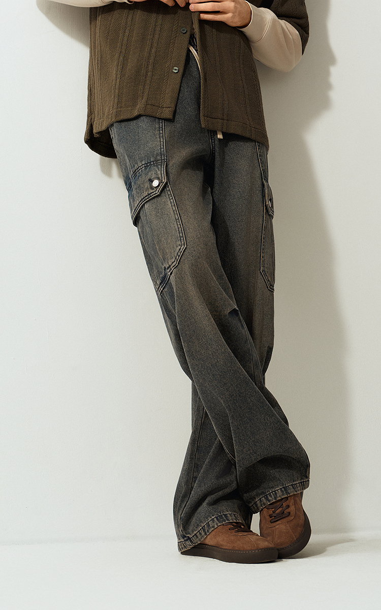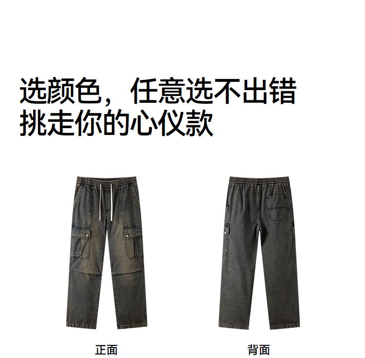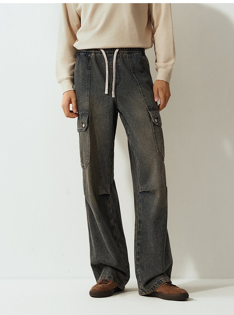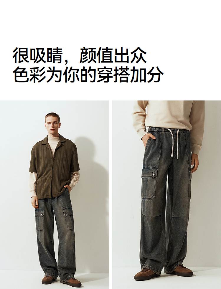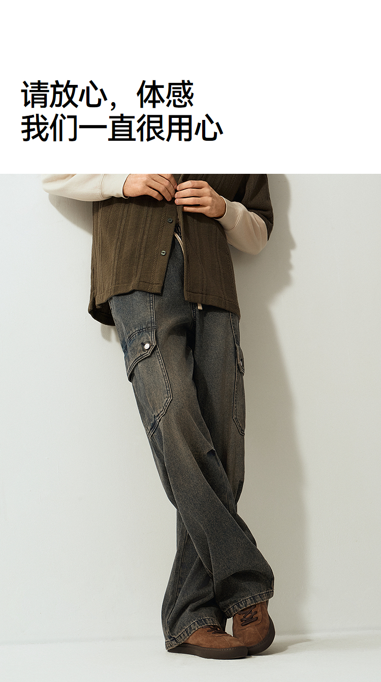 森马牛仔裤男宽松阔腿工装裤美式复古做旧大口袋2025冬季新款长裤