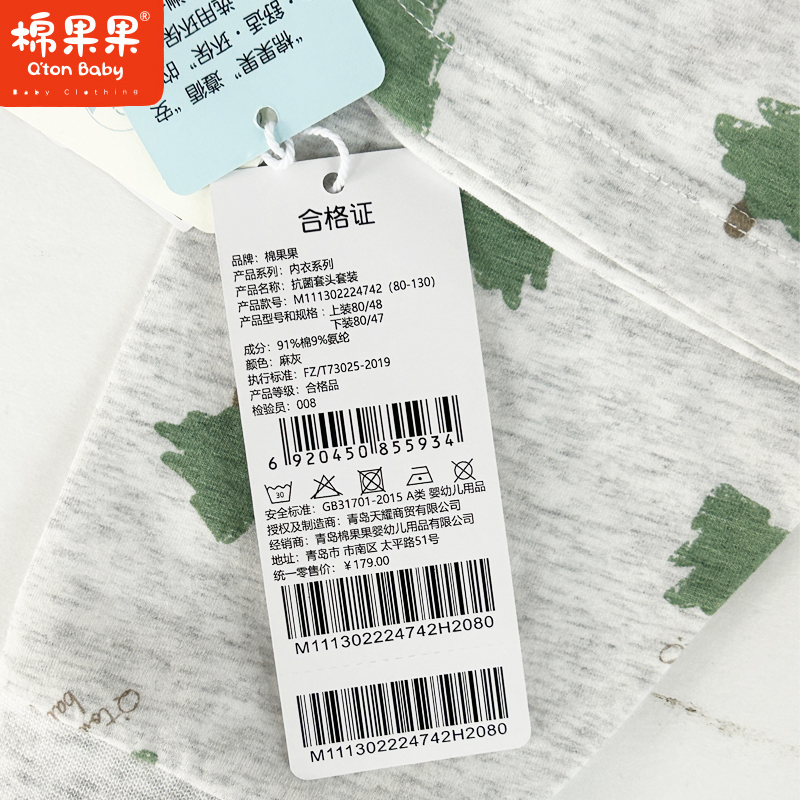 棉果果专柜同款春季新品内衣家居男宝5A抗菌抗菌套头套装M111302224742
