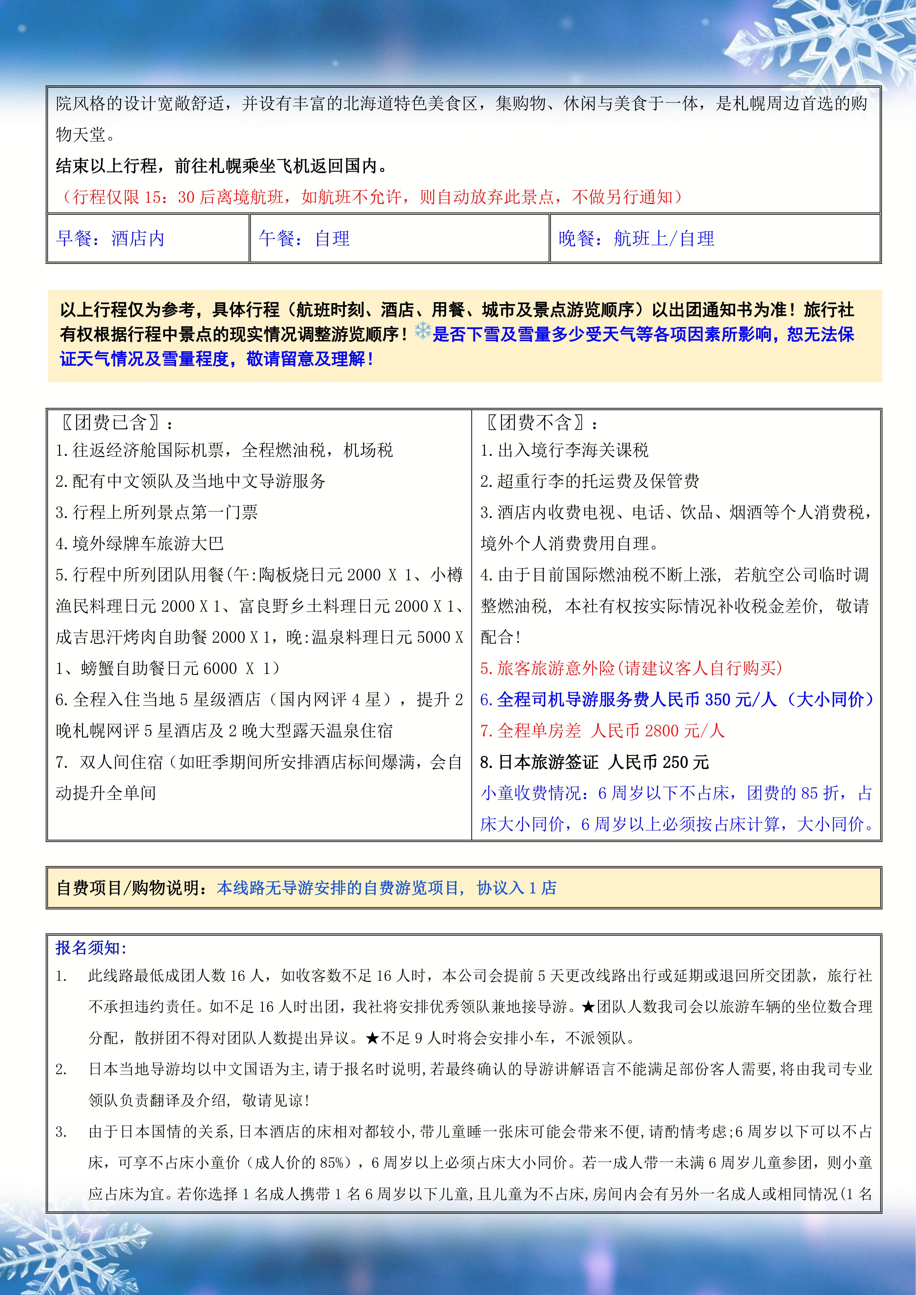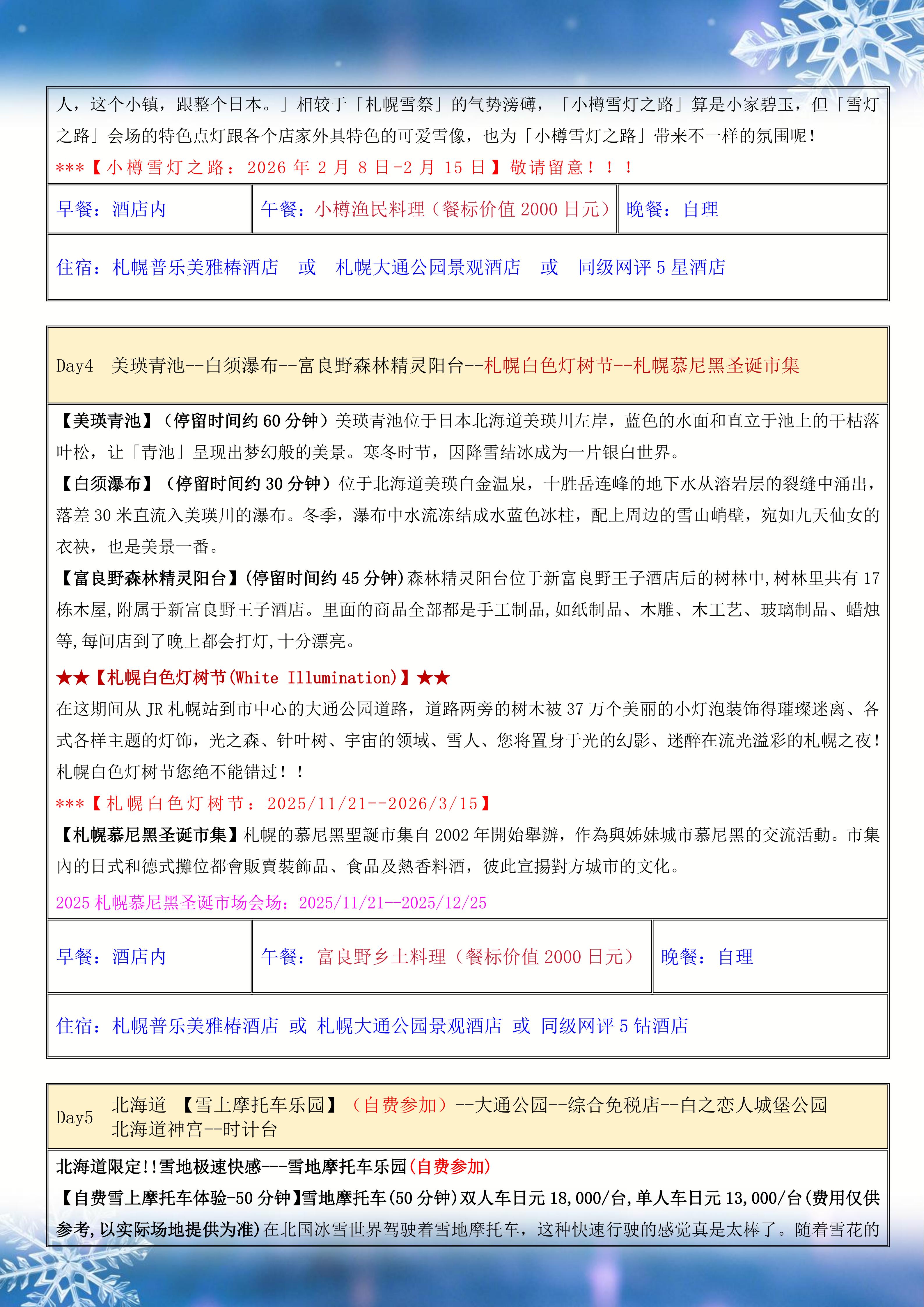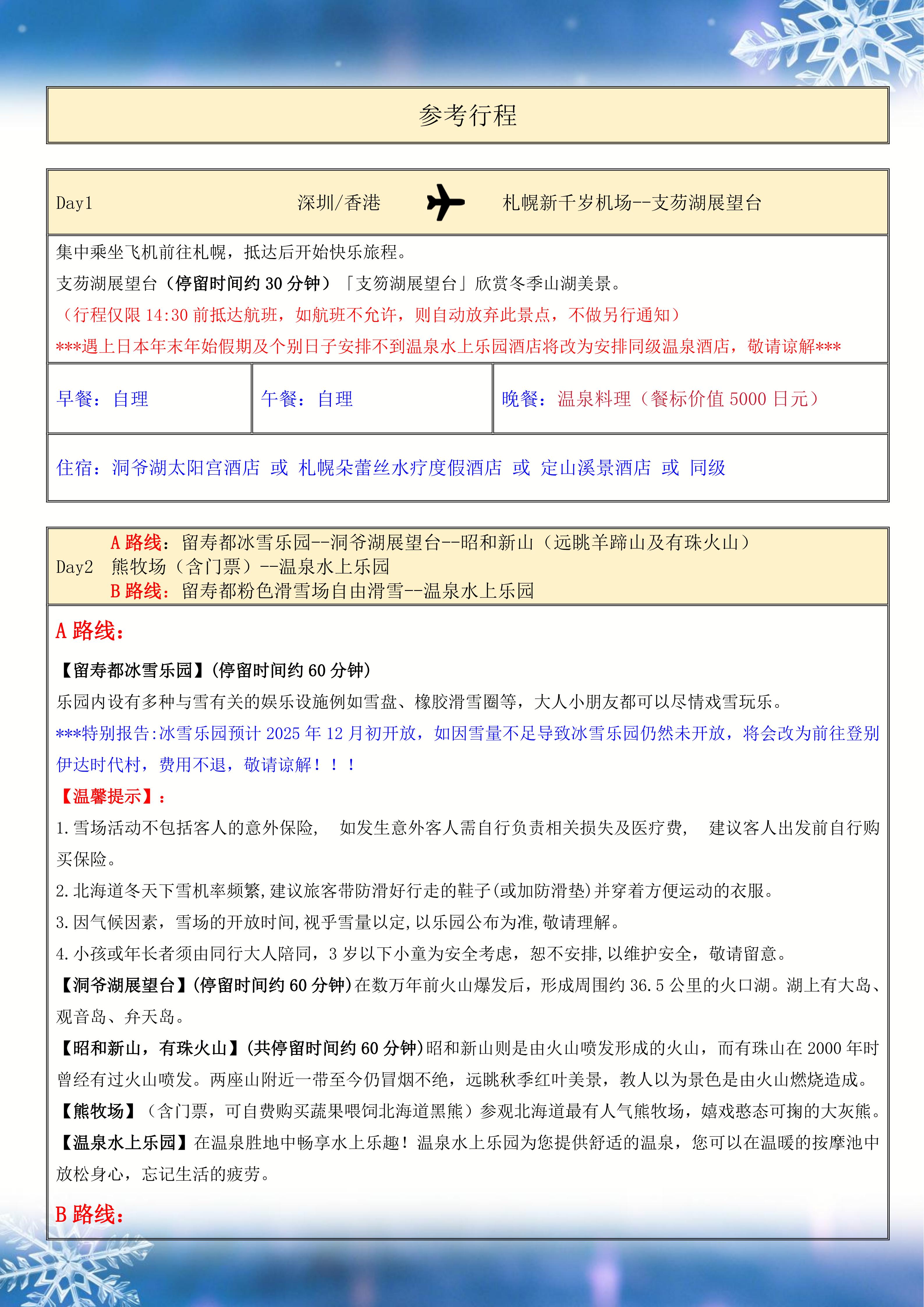 【圣诞、元旦】<日本北海道6天-深圳直飞往返>留寿都冰雪乐园/滑雪(二选一)、登别火山硫磺谷、登别企鹅出巡海洋城堡、小樽、美瑛青池、白须瀑布、富良野森林精灵阳台、札幌白色灯树节、北海道神宫