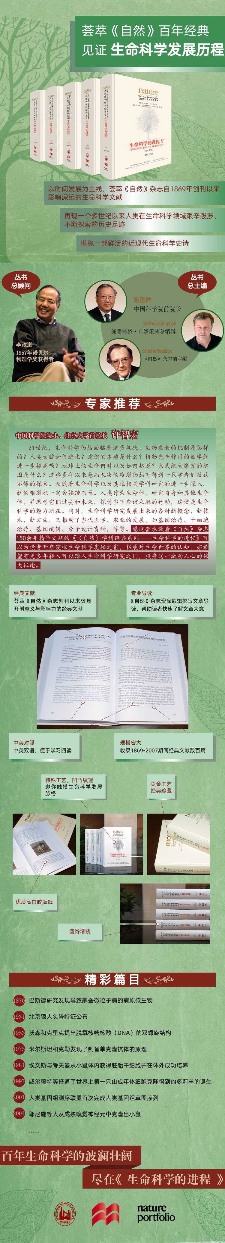 《〈自然〉学科经典系列:生命科学的进程(英汉对照)(套装共五卷)》,精选了《自然》杂志1869年至2007年期间发表的重要生命科学论文三百余篇。在这期间,巴斯德研究发现导致家蚕微粒子病的病原微生物,北京猿人头骨特征公布,沃森和克里克提出脱氧核糖核酸(DNA)的双螺旋结构,米尔斯坦和克勒发现了制备单克隆抗体的原理,埃文斯与考夫曼从小鼠体内获得胚胎干细胞并在体外成功培养,威尔穆特等报道了世界上第一只由成年体细胞克隆得到的多莉羊的诞生,人类基因组测序联盟首次完成人类基因组草图序列,耶尼施等人从成熟嗅觉神经元中克隆出小鼠……