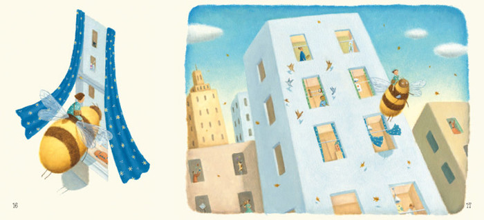 《我的蜜蜂朋友》:繁华的城市,高楼林立。一只蜜蜂从窗口飞入,几经周折,与屋子里的小姑娘成为了好朋友。日子一天天过去,满眼冷冰冰的钢筋水泥让蜜蜂感到厌倦,于是他背起小姑娘,飞出窗外,飞到一个非同凡响的地方……