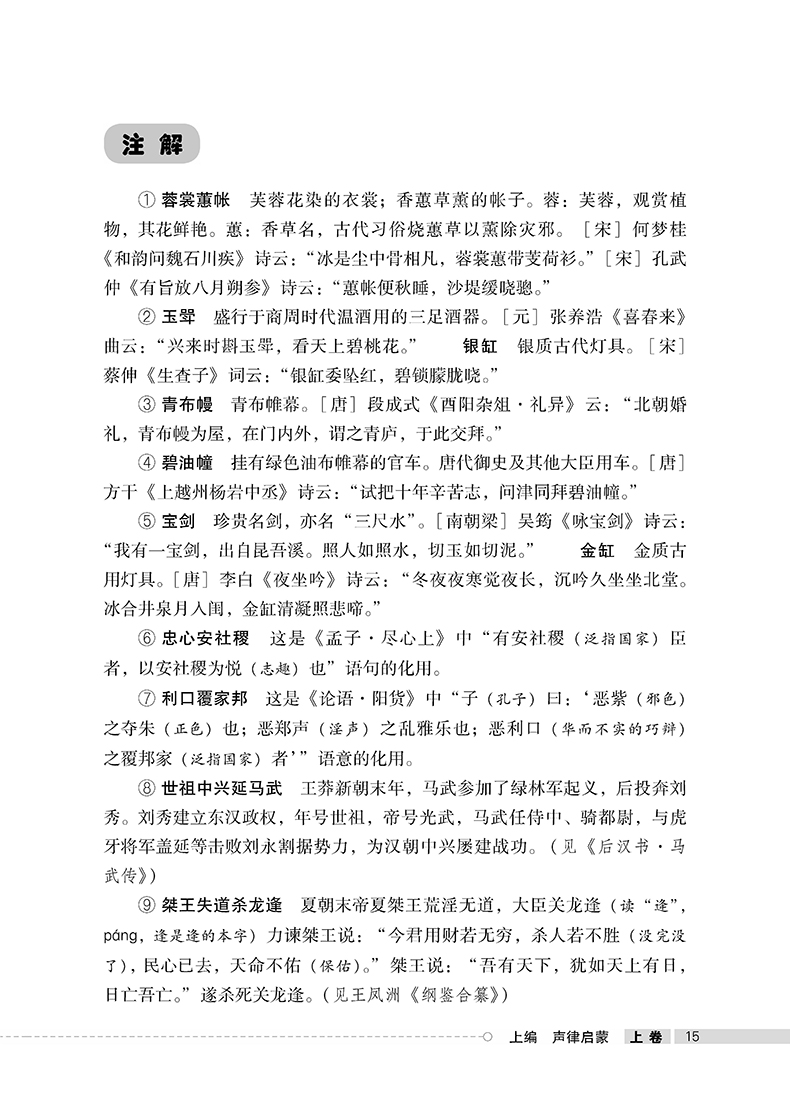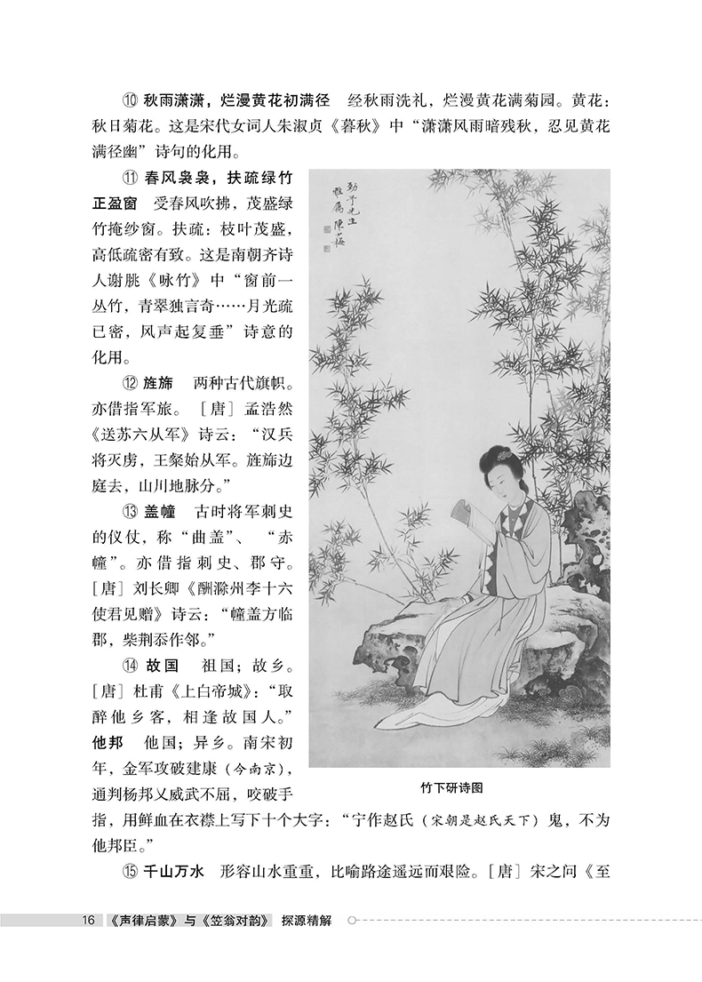 《声律启蒙》和《笠翁对韵》是学习汉语对偶技巧和音韵格律的优秀实用读物,其内容极为丰富,涉及天文地理、神话典故、时令文史、人伦世俗、宫室珍宝、山河景物、器用饮食、鸟兽花木等。原著的精美语句多源于古代的诗、词、文、赋,有的是引用原话,有的是化用句意,都蕴含着某种事物或某个典故。本书编者力求准确地找寻到每句话、每个典故的来源与出处,并探究出全句话的含义,以展现其精深广博的文化内涵。阅读此书,对于了解古代文化,丰富文学、历史知识,初步掌握创作诗词和撰写对联的语言技巧很有帮助。