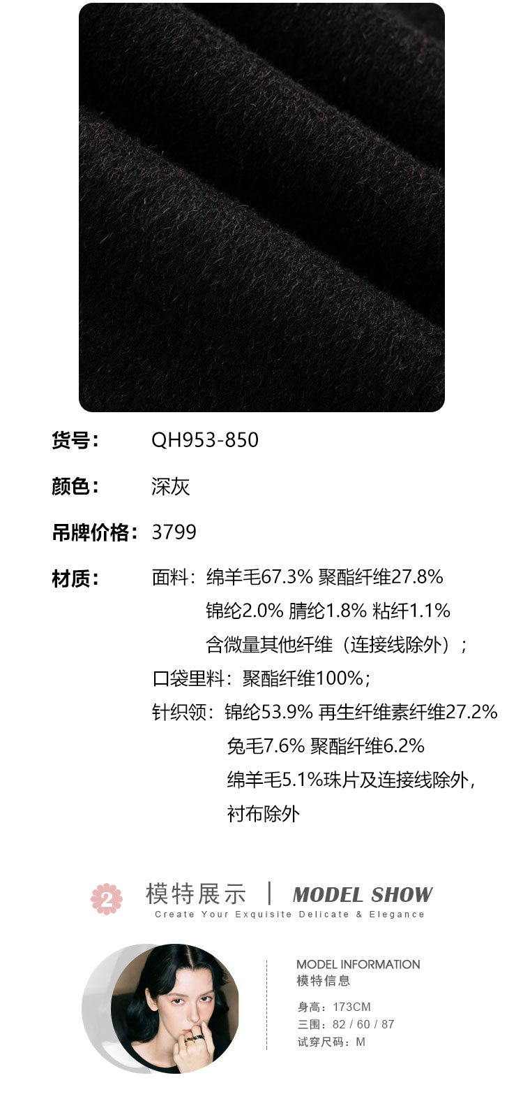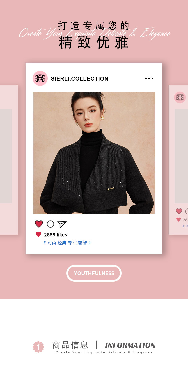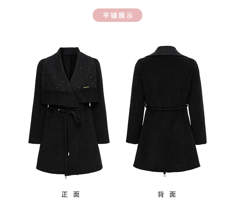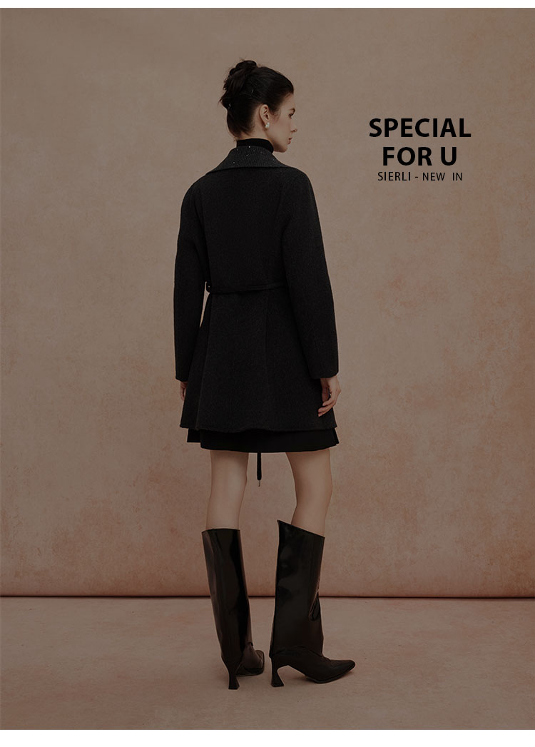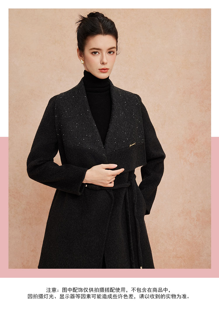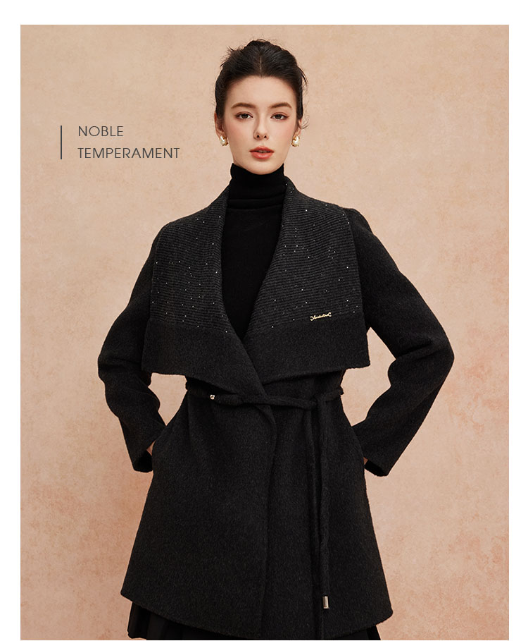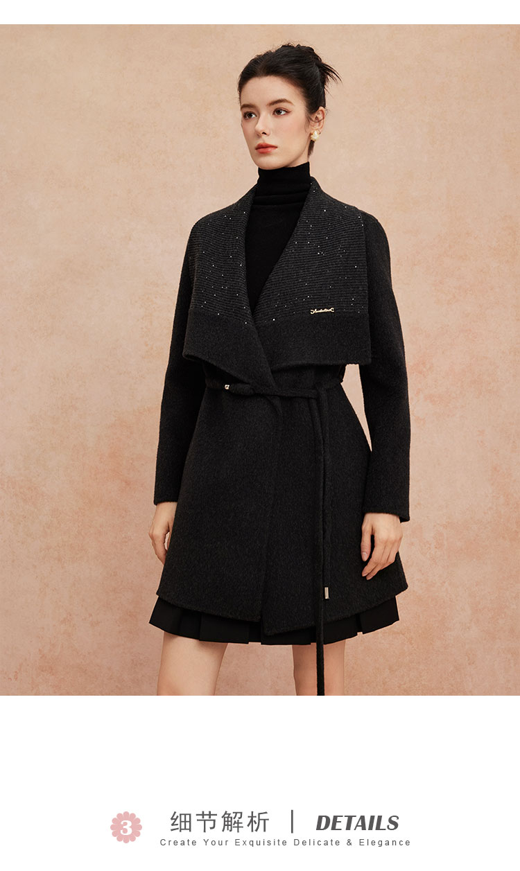 QH953斯尔丽2025新款气质静奢风精致亮片大翻领收腰一手长双面呢大衣