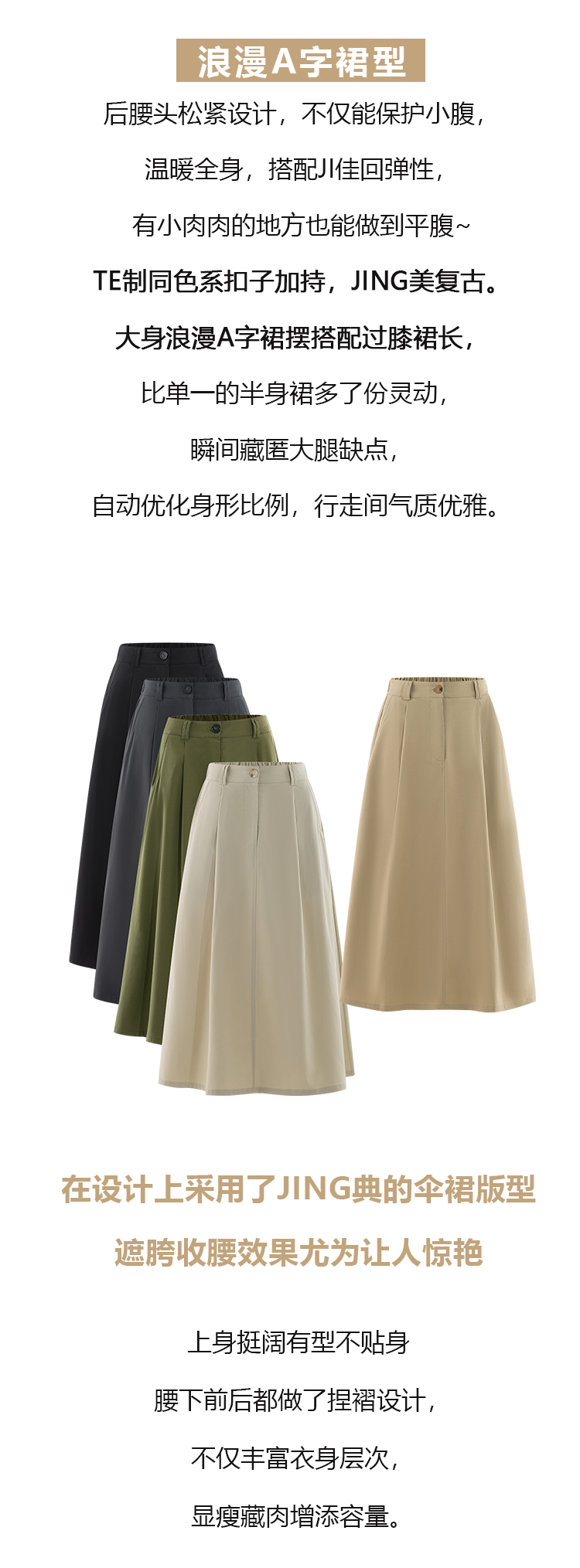 整个裙型挺括有度!厚度正好,可以一直搭配到夏天,伞裙式样就是丝毫不用担心胯部的问题,高腰设计的中长款,遮盖腿部缺点,对小个子宝宝也很友好!