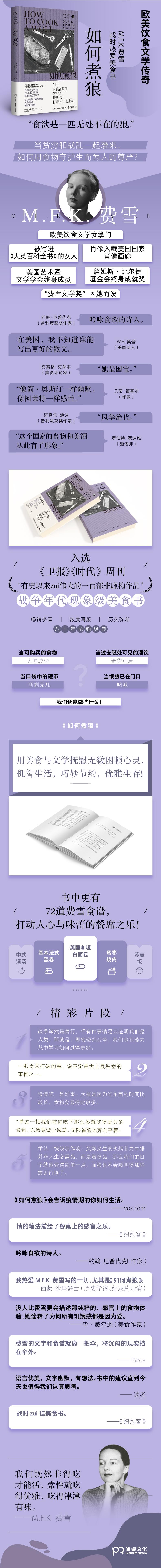 "《如何煮狼》是欧美饮食文学传奇M.F.K.费雪的代表作,该书出版于 1942 年,正值第二次世界大战,美国民众面临着严重的 食物紧缺。费雪用这一本书告诉人们,在困顿的日子里,如何用食物捍卫生而为人的尊严。 生活的艰辛是一匹无处不在的饿狼,它时刻在门口徘徊,刺激着你敏感的神经。 当可购买的食物大幅减少、过去随处可见的酒饮奇货可居,当口袋中的硬币所 剩无几,你仍然可以用经济的食材,做出精致的美食。能填补人生饥饿感的,永远是食物、温暖与爱。 全书包含费雪的 72 道食谱,让你既可以在节约的巧思中发现美味,也可以在偶尔的放纵下大快朵颐。"