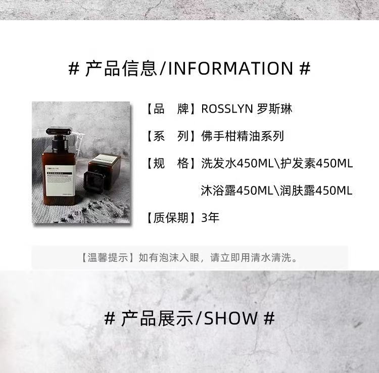 官方正品ROSSLYN罗斯琳佛手柑精油洗发水沐浴露护发素酒店同款