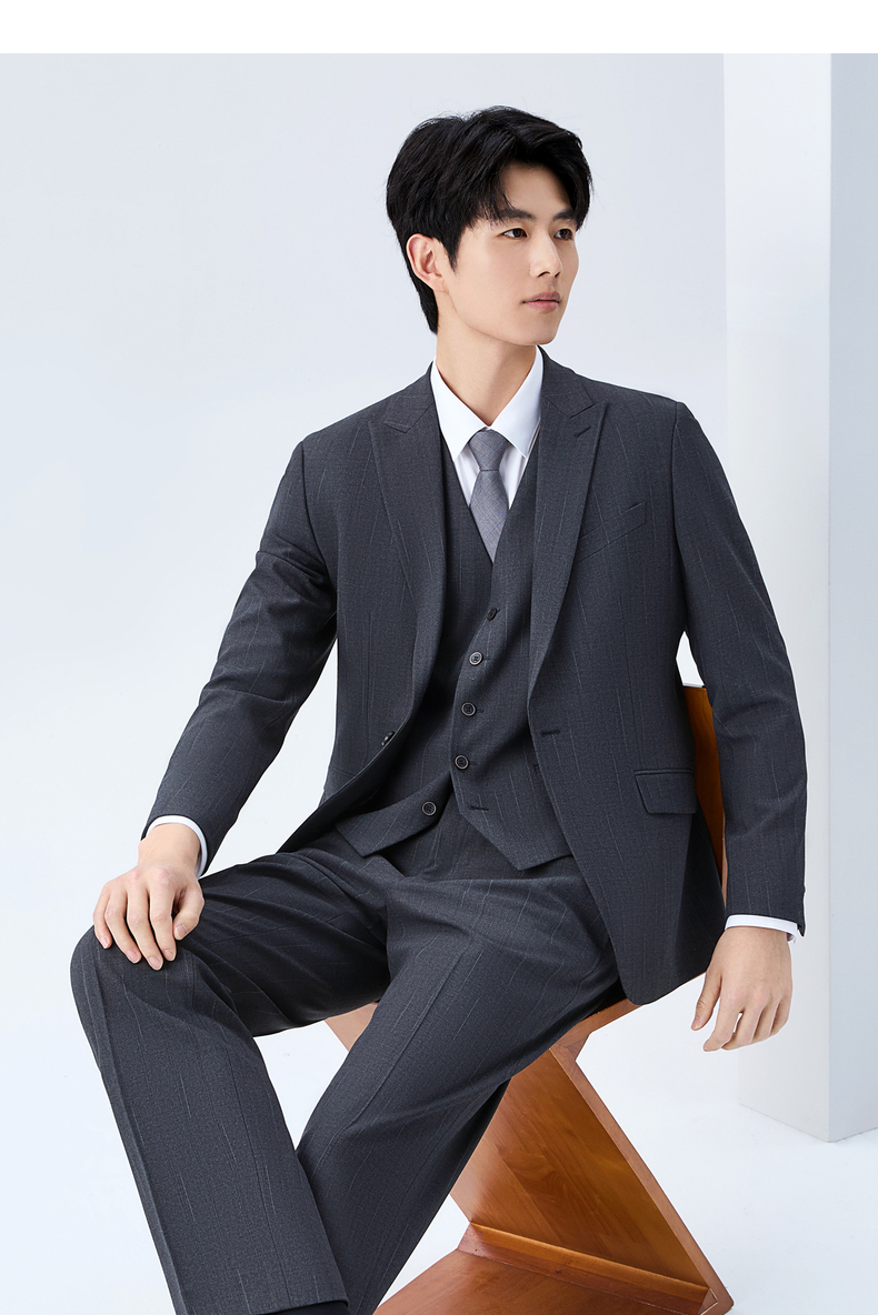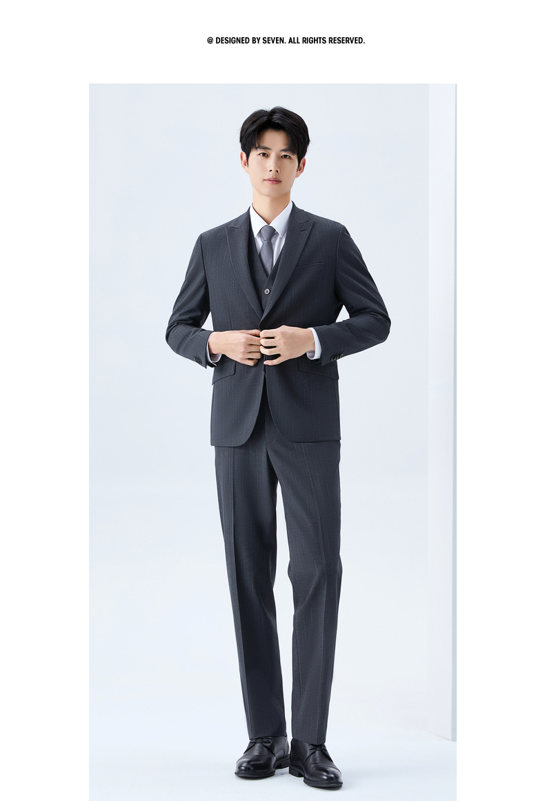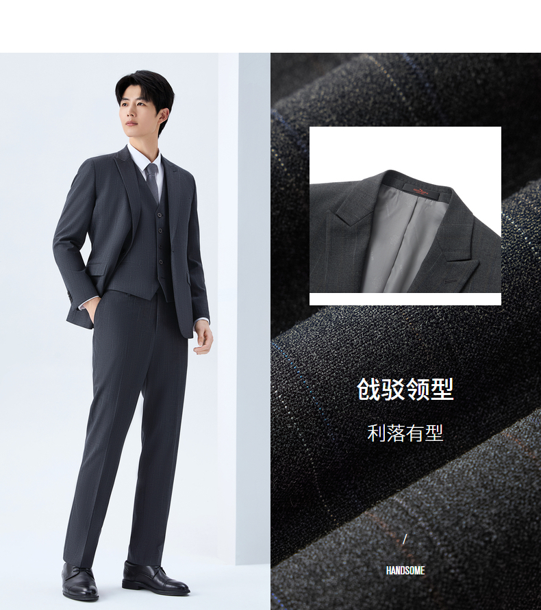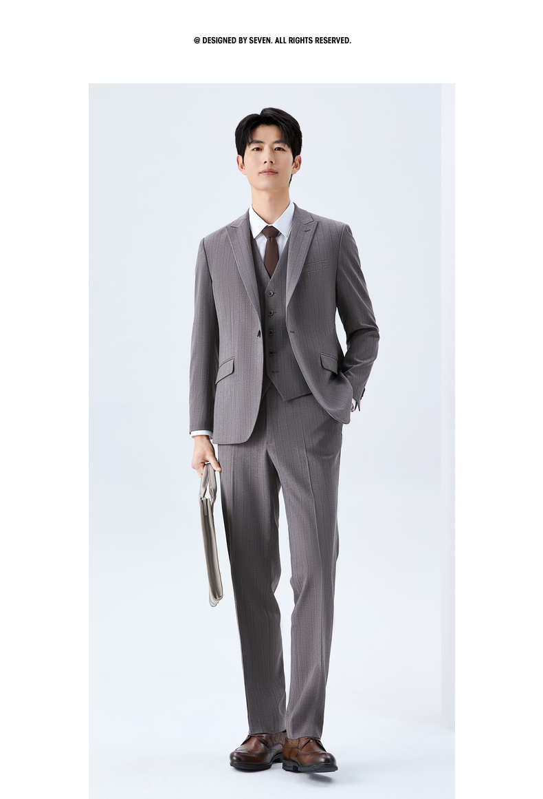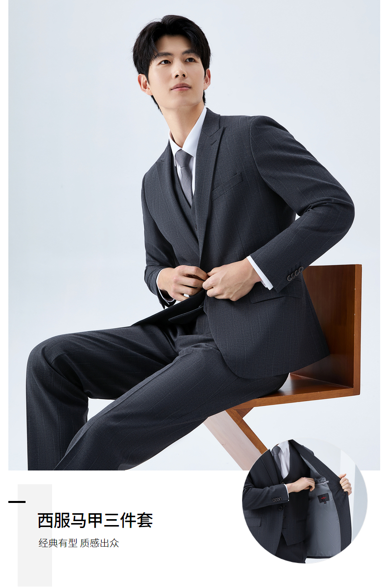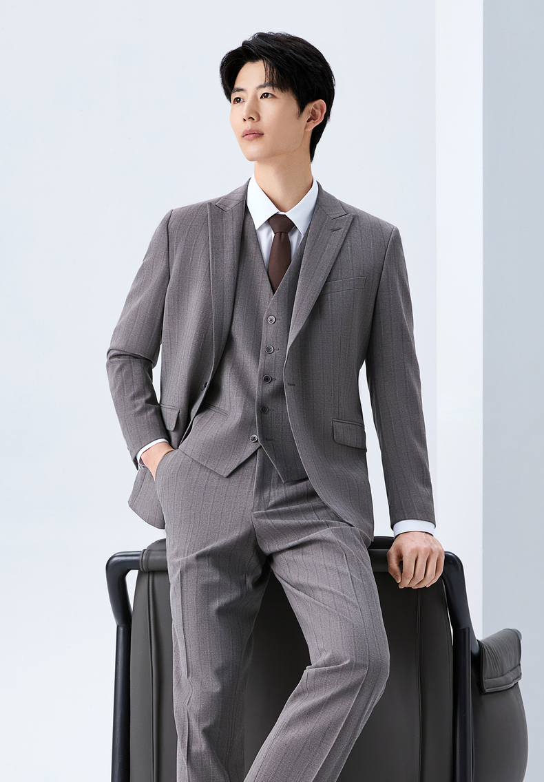 【色纺花纱三色条】柒牌男装2026春季戗驳领西服西装套装三件套130C70050