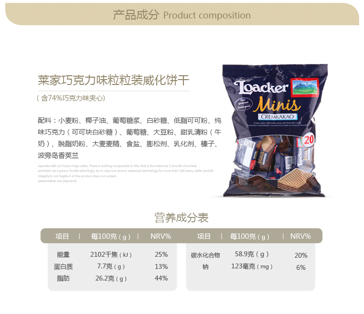 loacker 莱家 粒粒装 威化 巧克力味 袋装