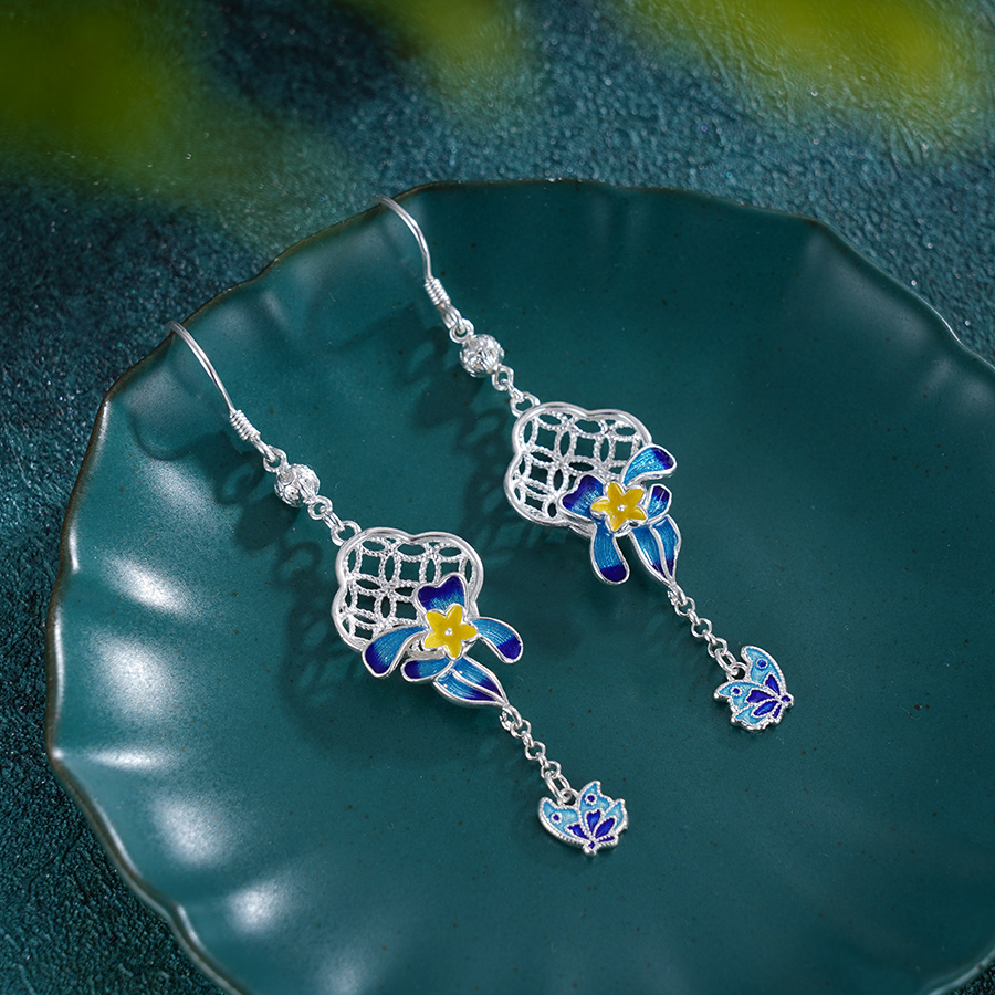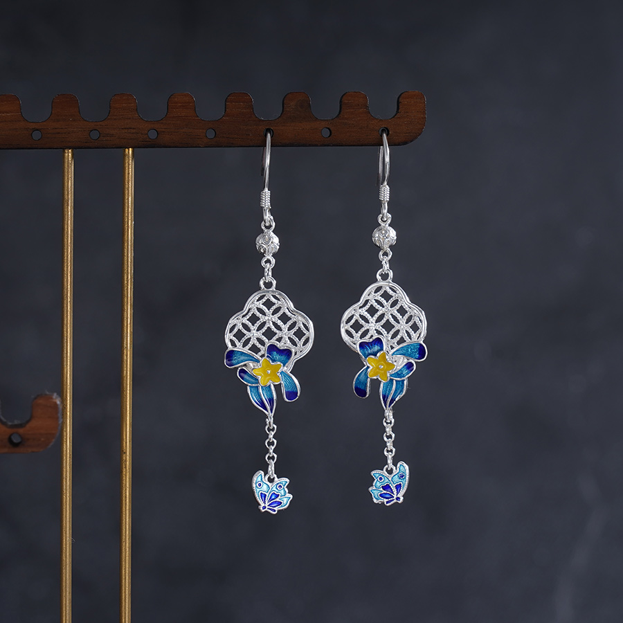 子佩集S990银[【花间蝶舞】耳环纯银【CEH000022】珐琅彩四叶草兰花窗格2501