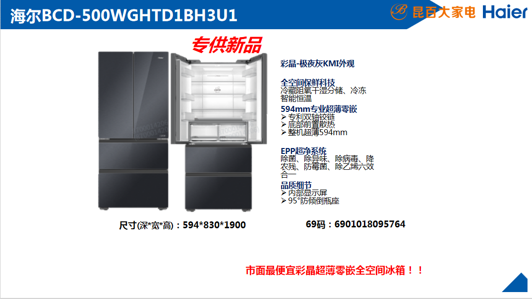 海尔 冰箱 BCD-500WGHFD1BH3U1 500升 百大专供 法式四门 一级能效 变频 风冷 电脑控温 触摸按键 594超薄零嵌 彩晶面板 极夜灰KMI拉丝
