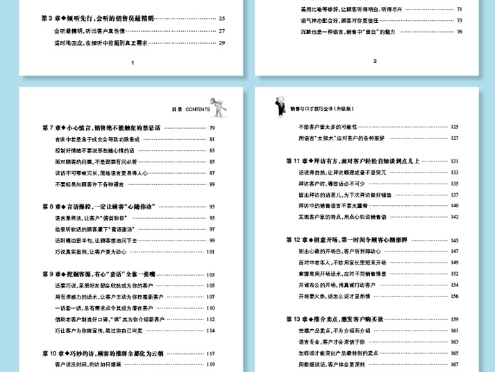 1章◆自信开口,做销售的人就是要敢说自身对产品充满信心,表达才更令人深信敢于自夸,“王婆卖瓜”的精神不能少赞美顾客用点心,别搞空穴来风遇到含蓄的客户,赞美可以温婉动听些3章◆倾听先行,会听的销售员精明适时地回应,在倾听中挖掘到真正需求听者有心,接过有利于销售的话茬儿提问需讨巧,从客户感兴趣的问题入手分寸拿捏好,提问的口气要小心积极的问题更易带动销售的氛围利用寒暄迅速与陌生顾客拉近心理距离遇到冷场时,客套话帮忙来调和寒暄的客套话也有所禁忌巧用声线,让自己的声音更有感染力善用比喻等修辞,让顾客听得明白、听得尽兴沉默也是一种语言,销售中“留白”的魅力言谈中若是急于成交会导致功败垂成面对顾客的问题,不是都要有问答不要轻易向顾客许下各种诺言语言激将法,让客户“俯称臣”话到嘴边留半句,让顾客想追问下去9章◆挖掘客源,有心“套话”全靠一张嘴用有诱惑力的话术,让客户主动为你挖掘新客户借助老客户制造好口碑,“哄”其为你介绍新客户10章◆巧妙约访,顾客的推辞全都化为云烟巧订约访日期为自己留出更余地不给客户留太多的可能性11章◆拜访有方,面对客户轻松自如谈到点儿上拜访客户时,哪些话不可少拜访中的销售语言不要太露骨12章◆创意开场,时间令顾客心潮澎湃面对中老年人,不妨用家长里短来开场开诚布公的开场,用真诚打动客户13章◆推介卖点,激发客户购买欲语言专业,客户才会深信于你用数据说话,客户体会更深刻14章◆消除疑虑,客户的心结全靠你来解开探明客户表面疑虑后的真实意图利用其他客户巧堵客户异议销售的语言流程怎样才合理接线人为难你时,该怎么说才能让准客户接即将结束时要为销售做好精心铺垫参考文献