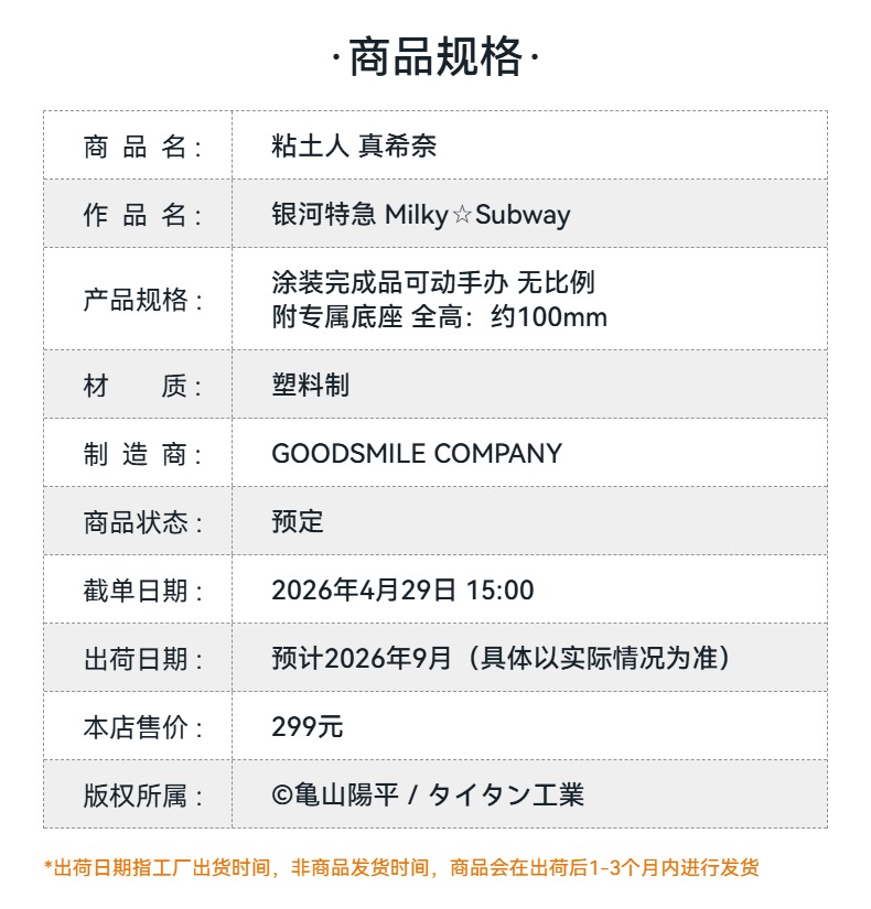 【GSC预售定金】粘土人 真希奈 银河特急 Milky Subway 附官方限定特典