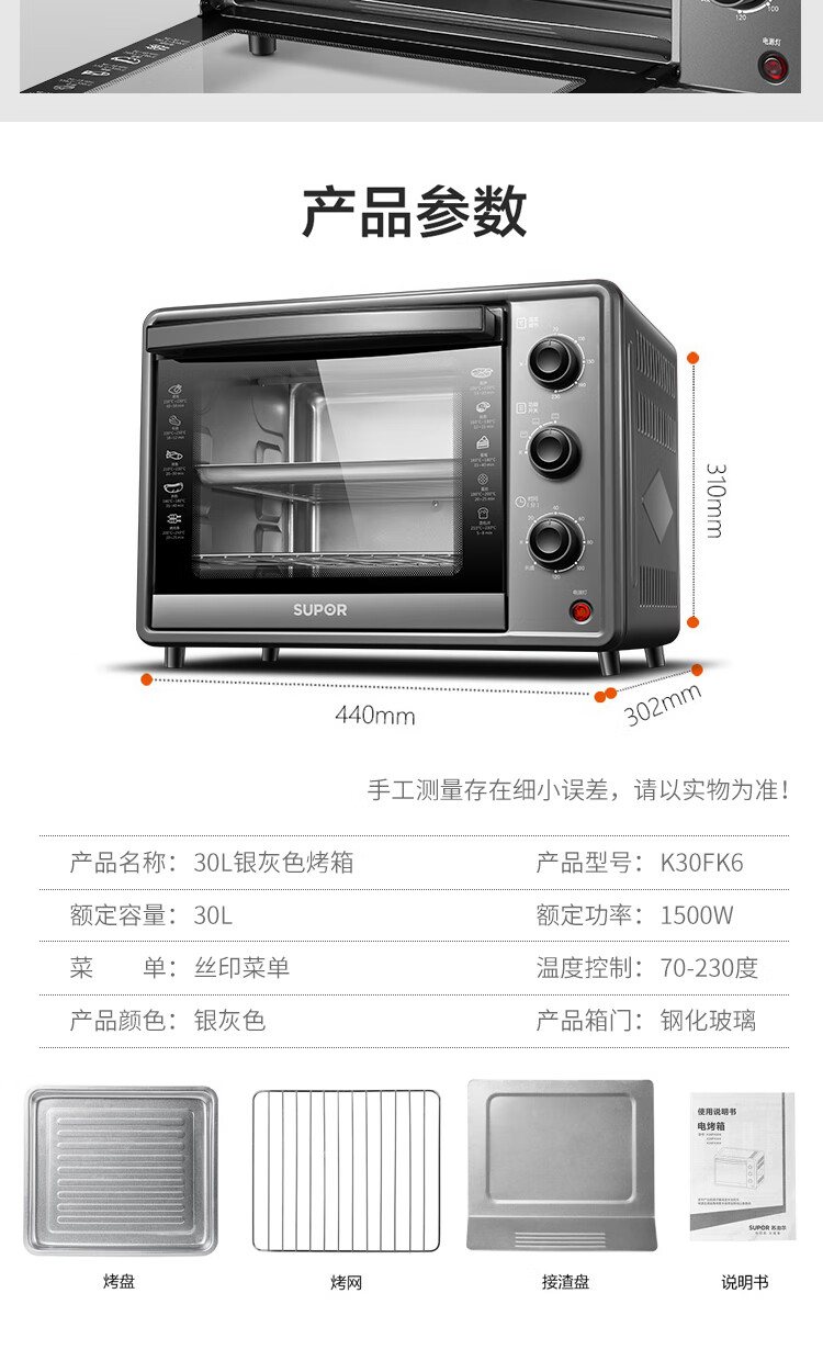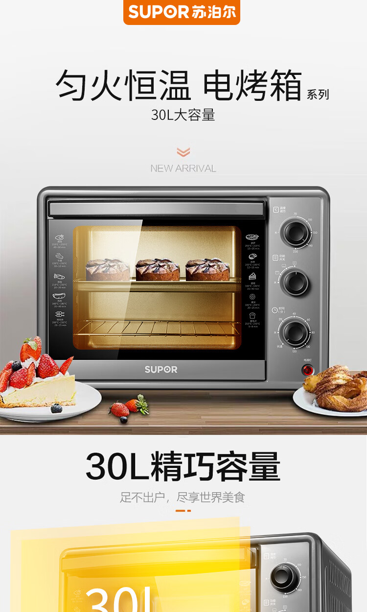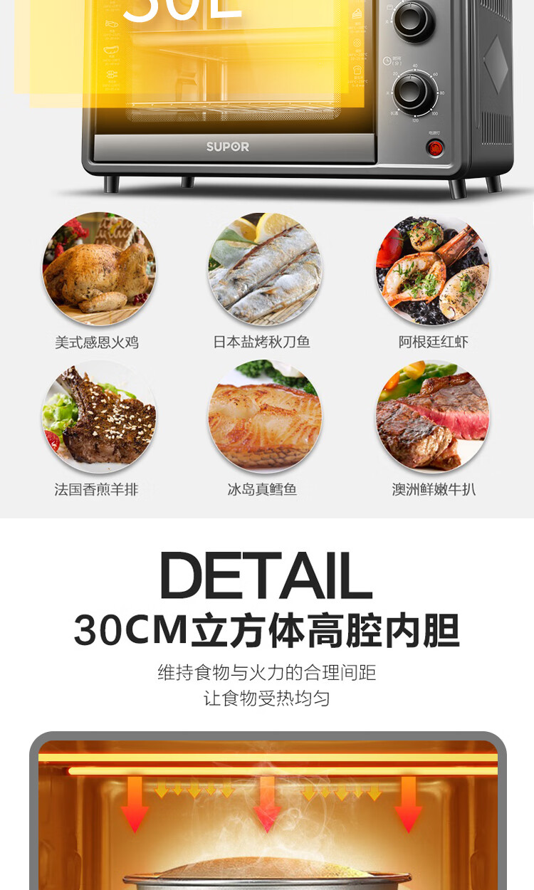 苏泊尔(SUPOR)电烤箱ZMD安心系列 30L主流容量 上下管统一控温 匀火恒温 家用多功能 K30FK6