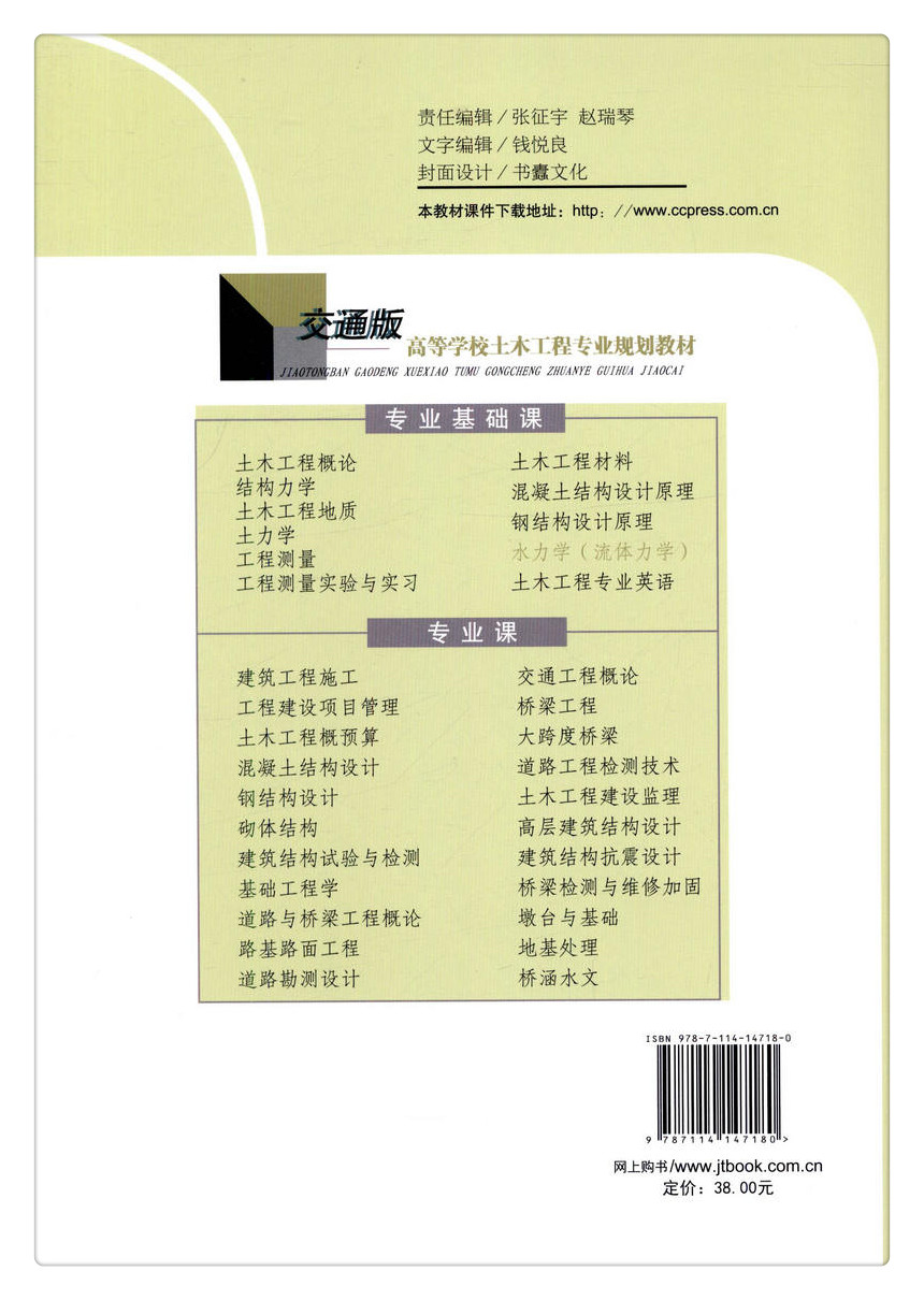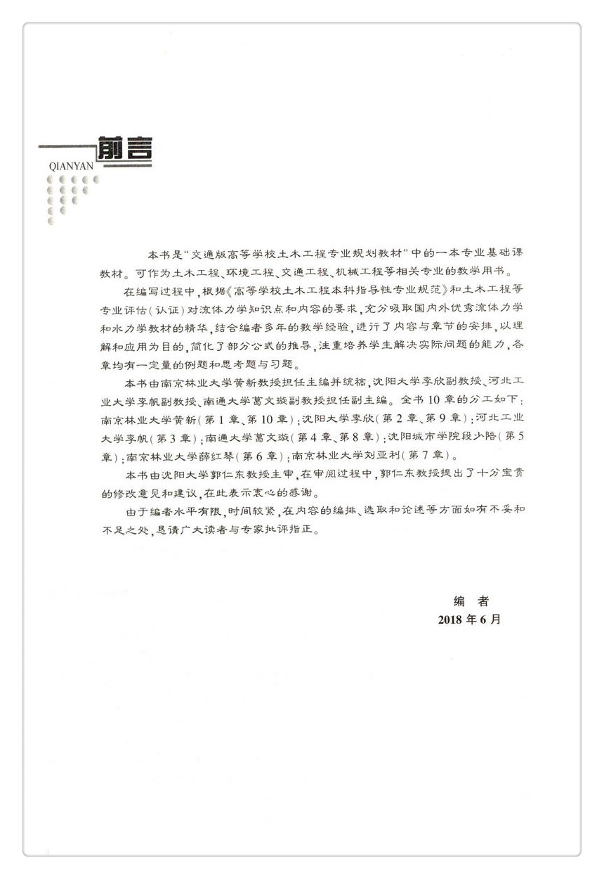 本书可作为土木工程、道路桥梁与渡河工程、交通工程、环境工程、给排水科学与工程等专 业流体力学(水力学)课程教学用书。建议教学时数为40学时。也可作为从事流体力学工作 的工程建设人员参考用书。