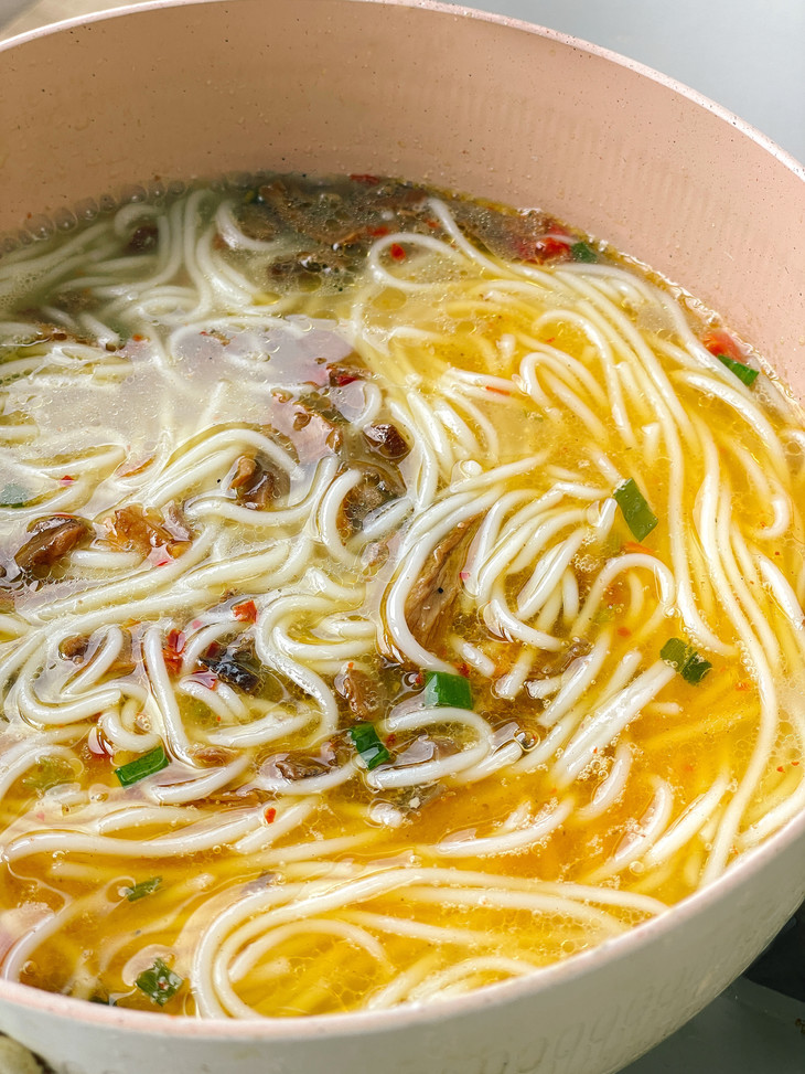 煮8分钟米线,用调料包备汤,搁一块儿就行!