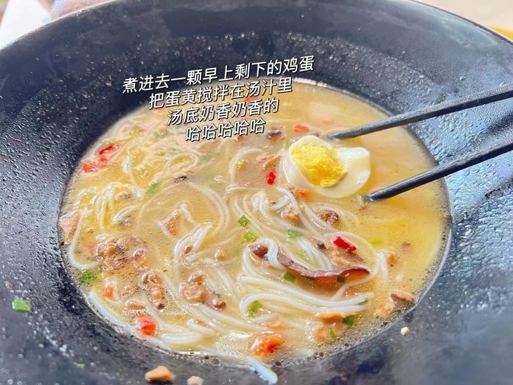 做法也简单,煮8分钟米线,用调料包备汤,搁一块儿就行!