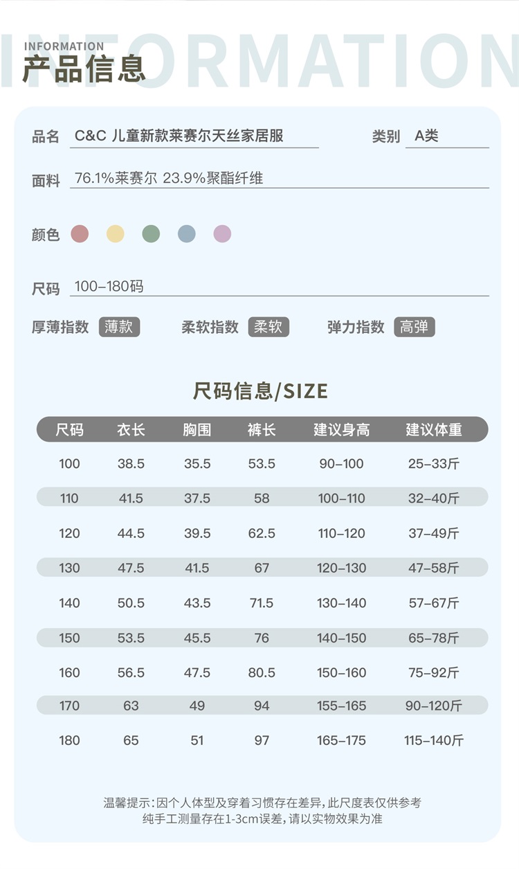 【品名】C&C儿童印花款莱赛尔天丝家居服套装 轻盈丝滑 柔软亲肤 小童/中大童 【规格】粉色小象、黄色小河马、蓝色小灰狗、绿色兜兜熊、梦幻紫苹果 【尺码】 小童:100-130 中大童:140-180 【产地】国内 【材质】 莱赛尔76.1% 聚酯纤维23.9% 【发货包装】独立包装 【发货地】浙江 【发货快递】圆通、中通随机发 【补邮费地区】 新疆、西藏+15元 青海、甘肃、宁夏、海南、内蒙古+5元 【发货时效】48-72小时,周末节假日顺延 |