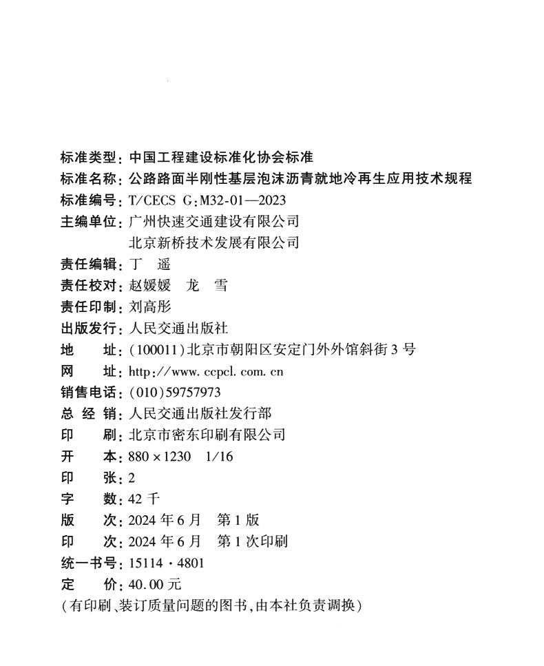 书名:公路路面半刚性基层泡沫沥青就地冷再生应用技术规程(T/CECS G:M32-01—2023)