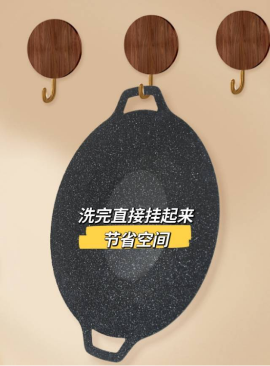 麦饭石不粘锅,一擦即净,户外也能轻松清洗。洗完往墙上一挂,节省空间易收纳。