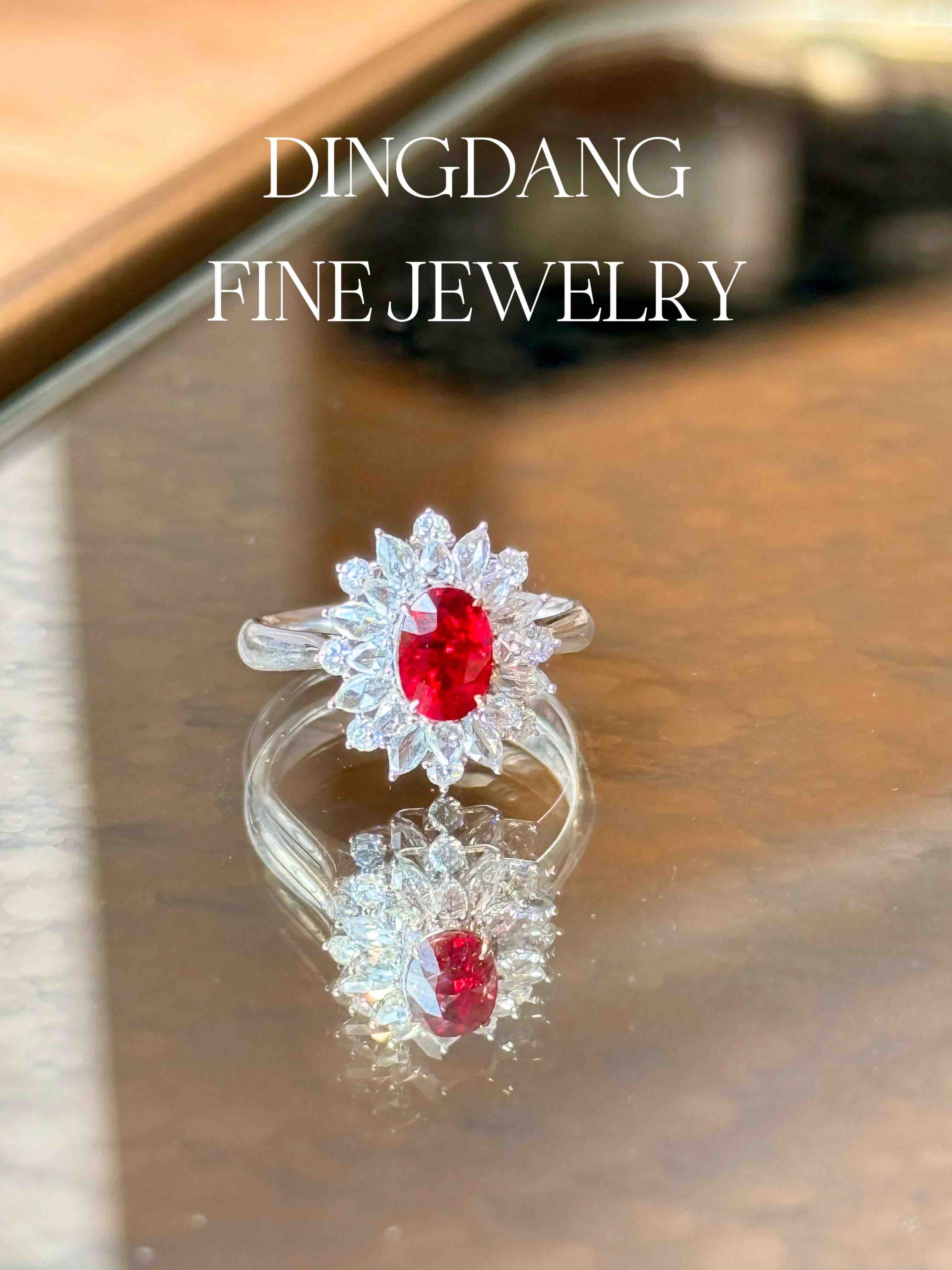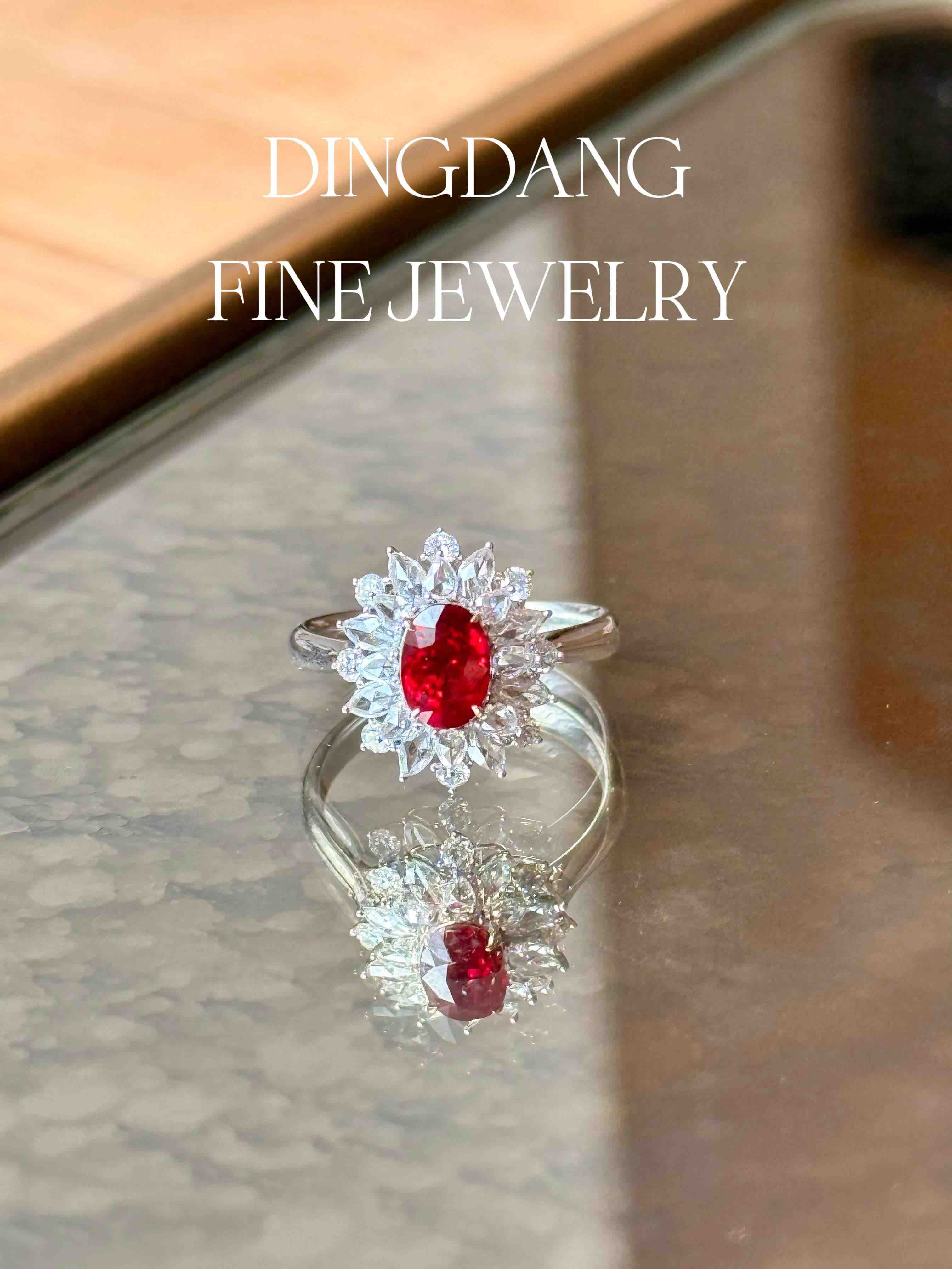 缅甸特有的强荧光,在光下火彩熠熠,深深被美到,主石1.06克拉,镶嵌也是非常精致华贵,不同切割的钻石层层围镶,层次分明典雅,贵气,上手高级感、贵气十足,吉尔德证书,vivid red!