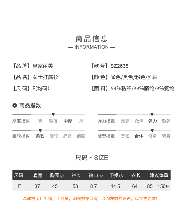 【适合85-150斤】皇家丽美微薄柔软有弹力修身女士打底衫SZ2638