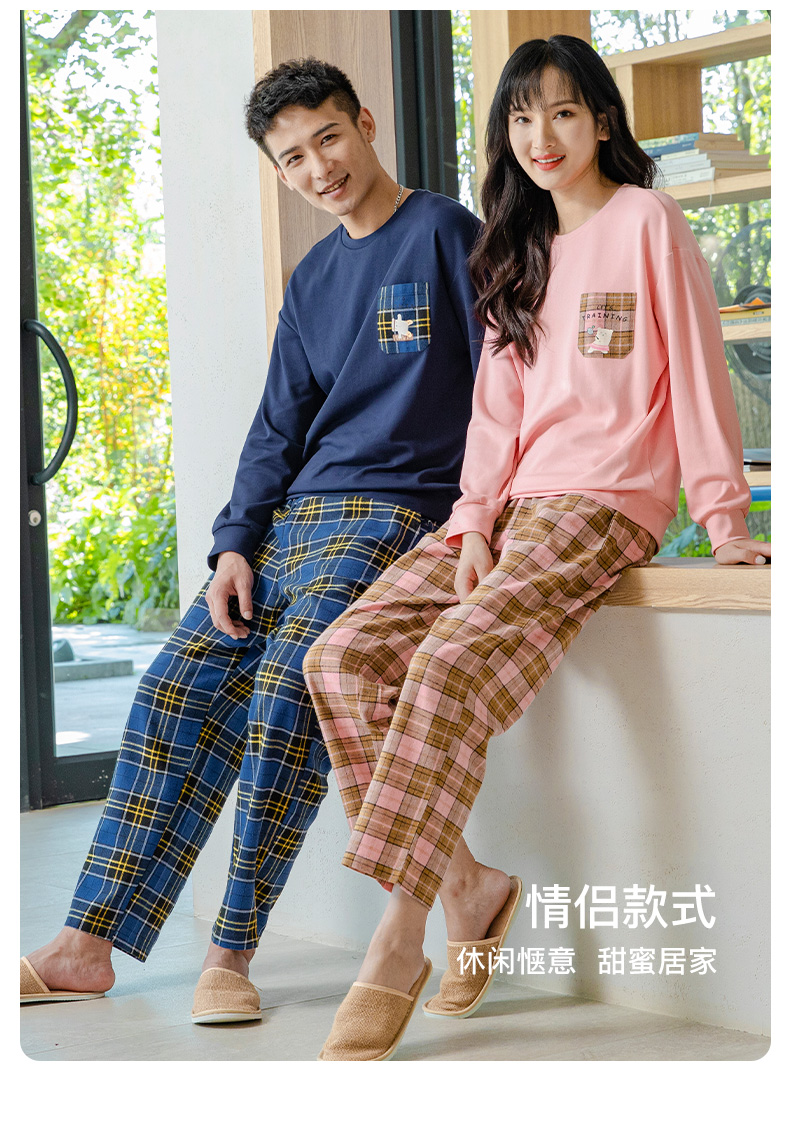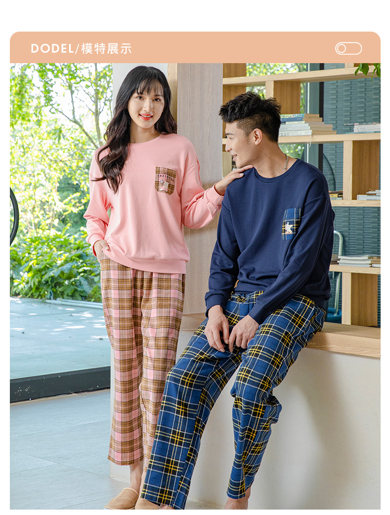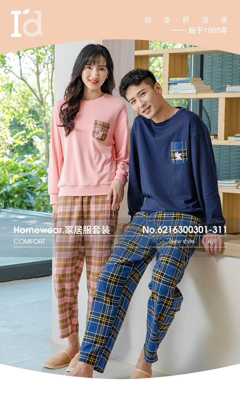 爱帝情侣睡衣休闲套头格纹长袖家居服