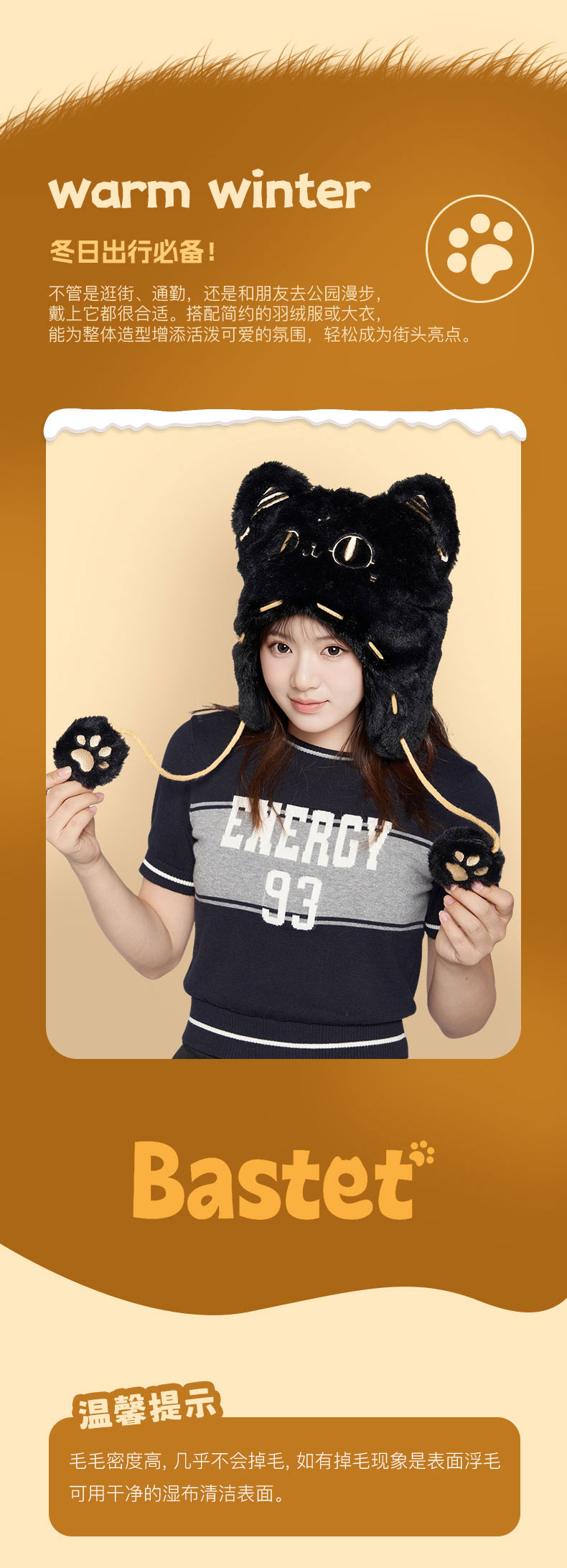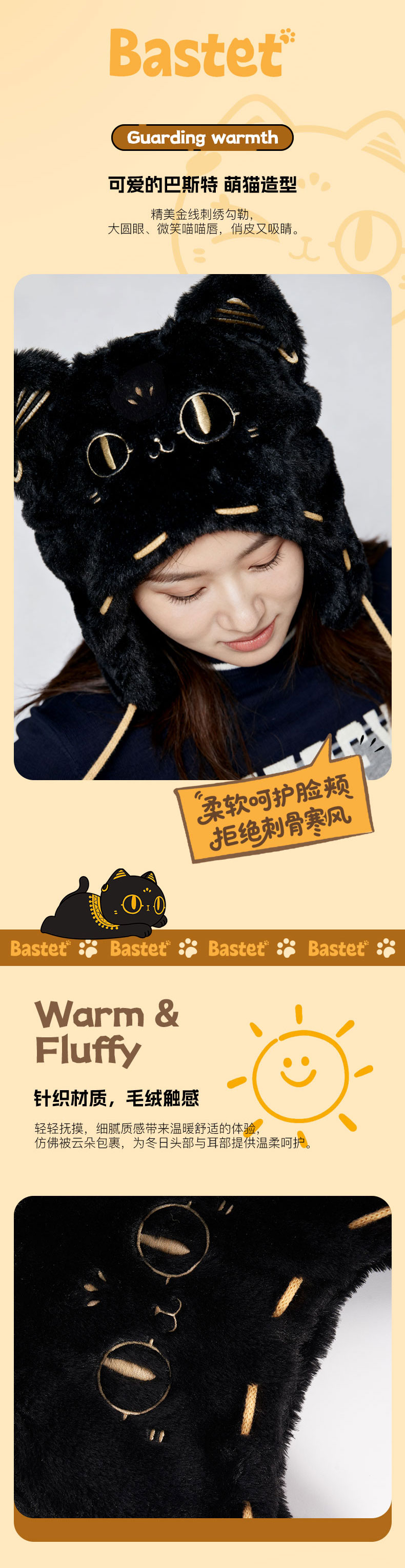 大英博物馆 盖亚·巴斯特系列 萌猫毛绒护耳 连帽渔夫帽-黑色