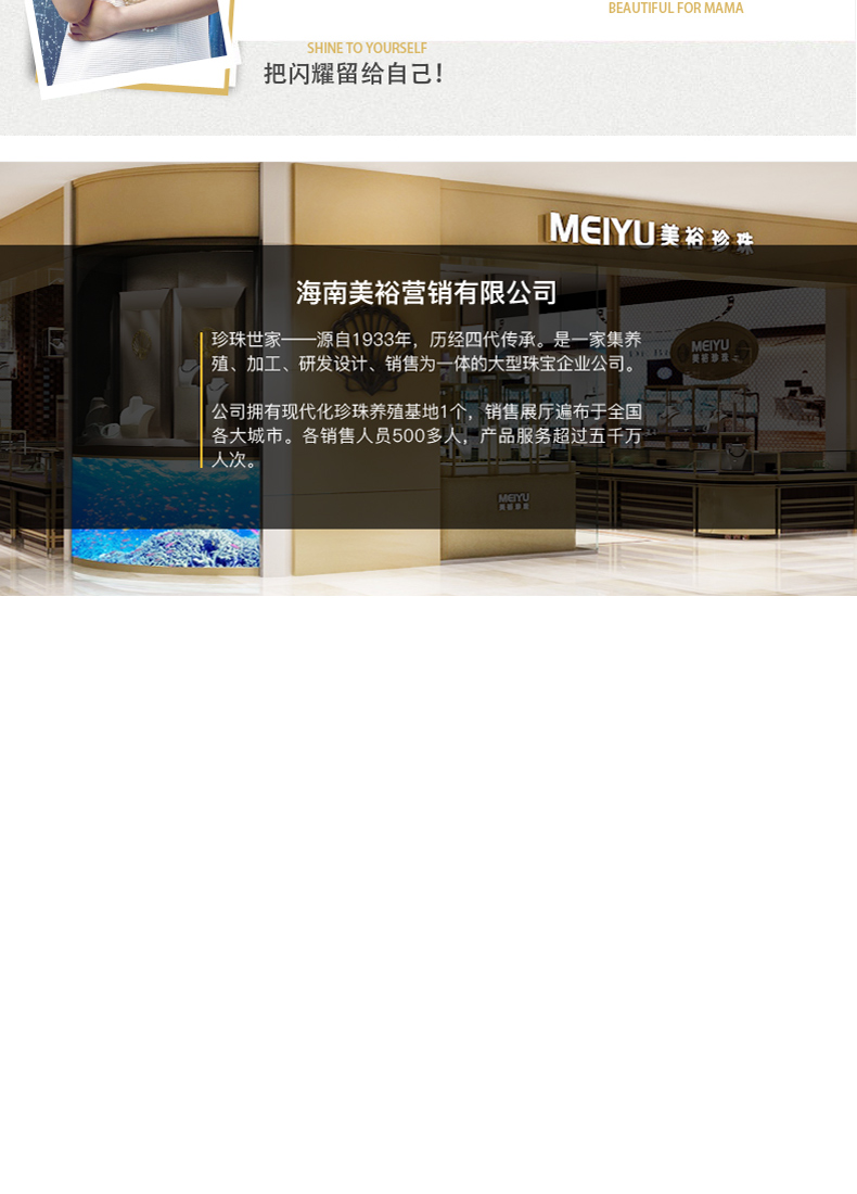 珍珠世家,代代相传。美裕珍珠,1933年起源于印尼,成长于海南岛。依托海南资源优势和自身专业优势,以经营南珠、南洋珠为主,专注于珍珠文化的挖掘和传播,把珍珠代表的爱意,永不间断地传承下去。