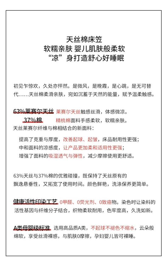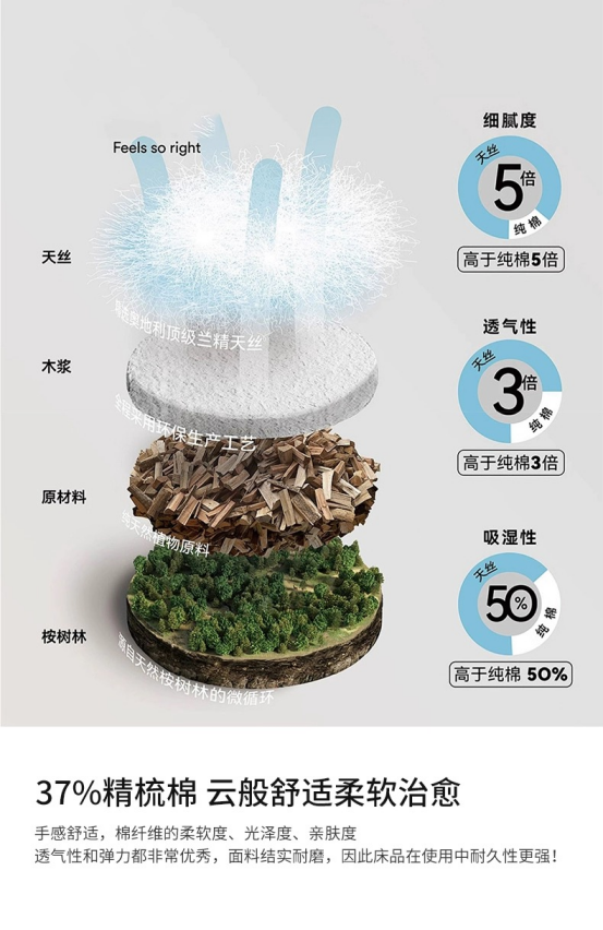 水洗天丝面料,垂顺有光泽,触感温和又爽滑,还自带微微凉感,夏天开空调也不会觉得冰。天丝的透气性也不错,身上出的汗能及时排出,凉快不粘身,被窝里干干爽爽,不用凉席也能赶跑身上的热气 同时产品还经过安全检测,对床品有更高要求或喜欢裸睡的朋友们睡,更安心。 毕竟一天至少有八个小时的睡眠时间,选择舒适 又安全的床品很重要