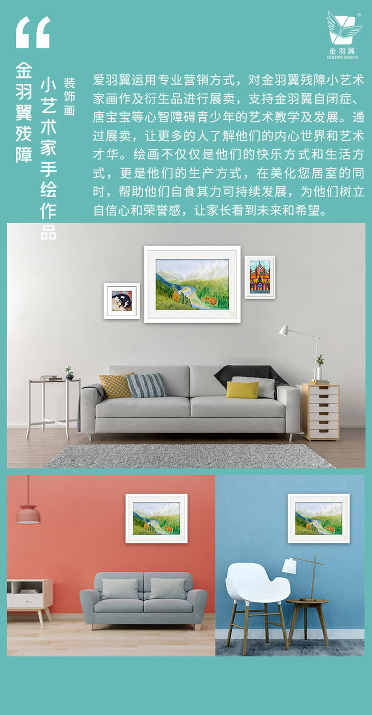 - 金羽翼将艺术与心理治疗相结合,用艺术教育的形式帮助残障青少年体现自身价值、提高生活质量、实现艺术梦想,并将绘画作品开发成衍生品销售,收入扣除成本后,20%返还给学员家庭,80%用于金羽翼艺术康复教学。