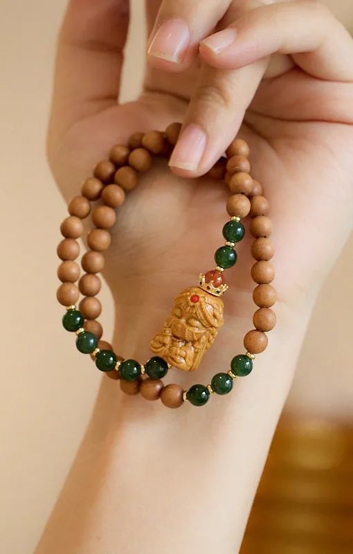 绿檀色泽优雅美丽,我们精选优质绿檀木磨成圆珠,搭配浮雕莲花、金刚菩提,寓意好运莲莲,蒸蒸日上。
