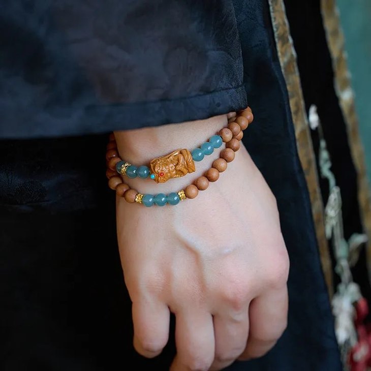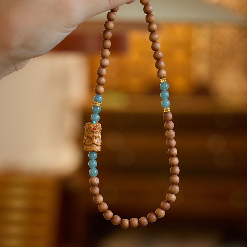 暖色调的芭比檀木珠,搭配湖水绿的和田玉和财运扎基拉姆,清新自然。