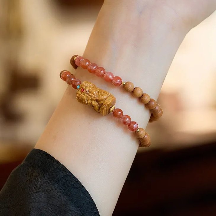 芭比檀搭配南红,一半木珠,一半南红,碰撞出独特雅致的国风韵味。一冷一热相遇,如此和谐美妙。