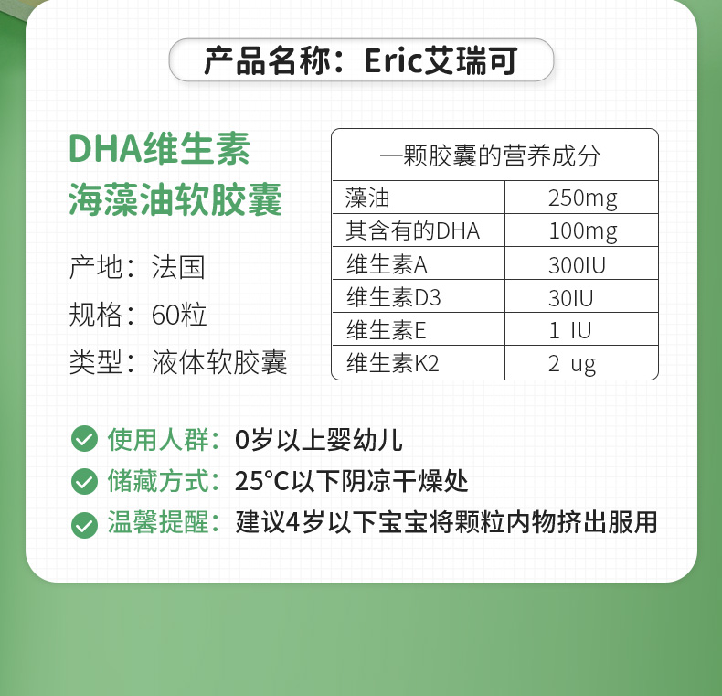 【保税】法国Eric Favre艾瑞可 婴幼儿海藻油DHA 60粒