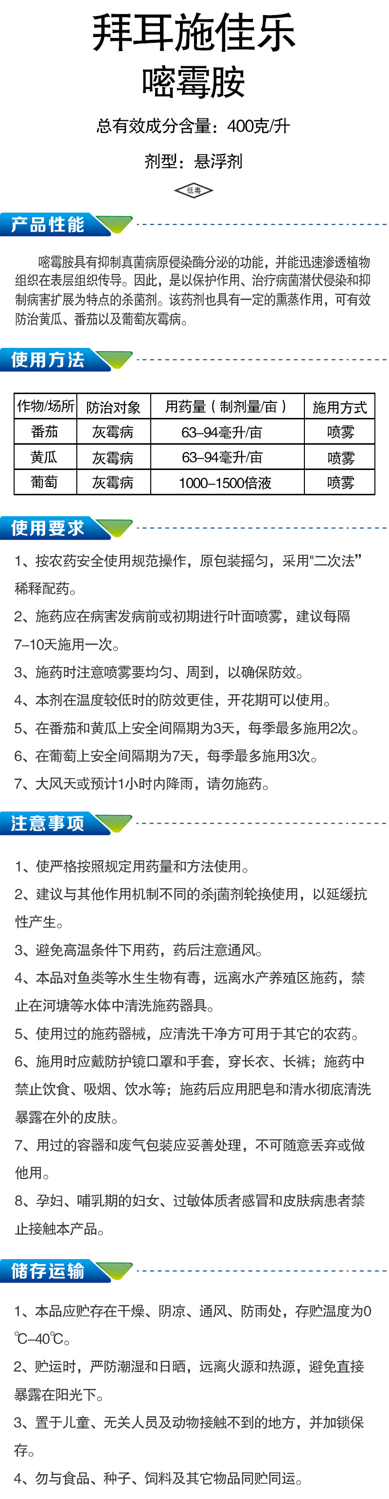 施佳乐嘧霉胺 对葡萄灰霉病、穗轴褐枯病防治效果良好。